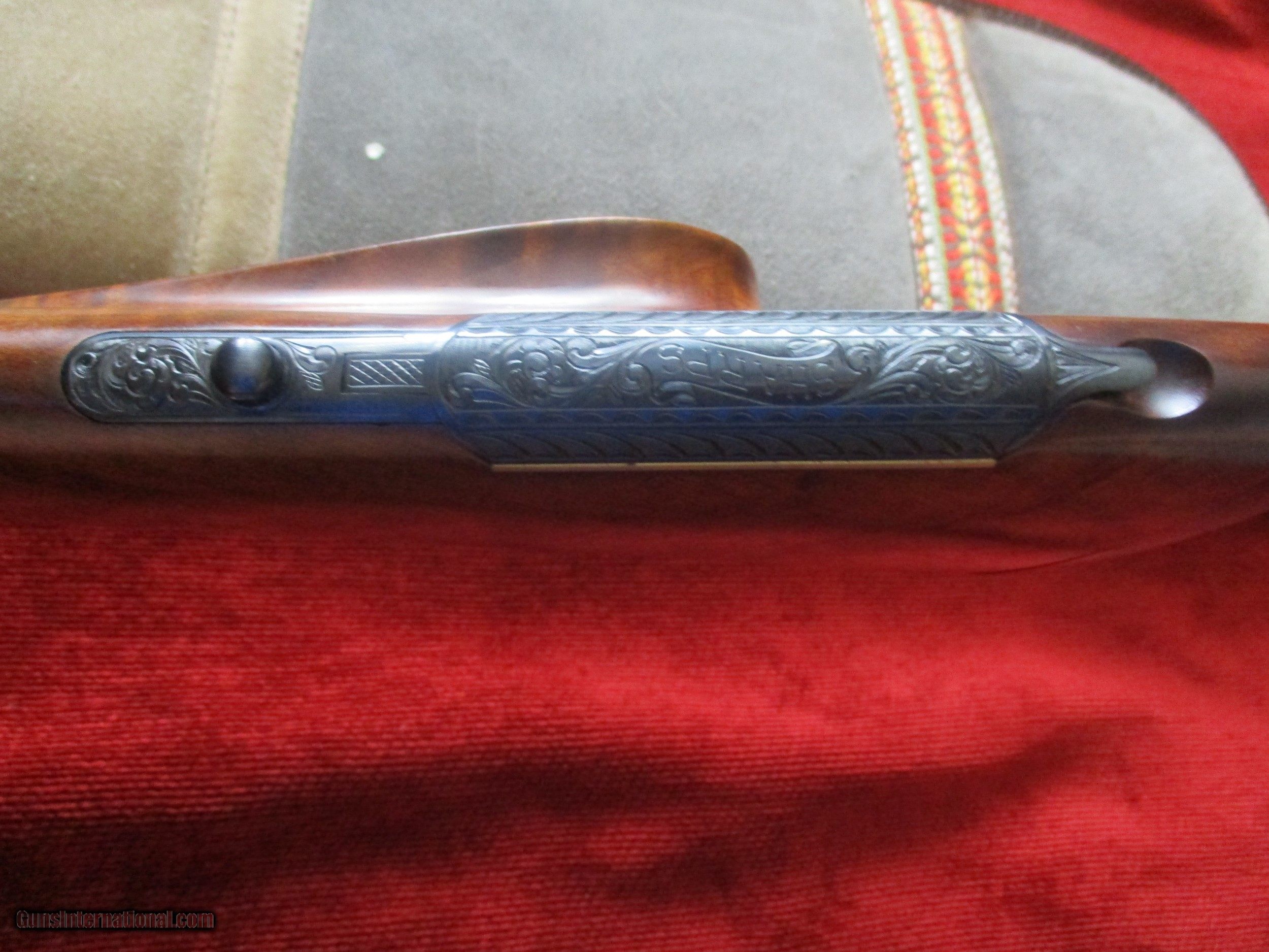Description: 26" sporter hi-gloss bbl., quater rib, Sharps falling block action, Timken bearings, Canjar set trigger, deluxe Fleur - De-Lis checkered Monte Carlo exotic walnut stock , oil finished, cheekpiece, deluxe engraved buttlet trap door, factory solid 5/8" hard rubber butt,98% shot little, factory supplied base & rings also decortive suade leather field case: SOLD |