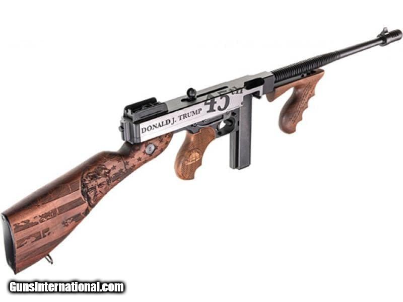 Description: Guns Listing ID: 388266 The "Trump Thompson" starts as a Model 1927 Tommy Gun, chambered in .45 ACP. It is entirely manufactured in the USA from quality steel and American walnut. On the right side is engraved an American flag and the image of our 45th President. His name and 45th are engraved on the receiver. The grip contains his famous quote drawing the line at infringing on Americans' rights. On the right stock are engraved the Presidential Seal, American Flag, and the White House. The grip contains another important quote from President Trump defining the Second Amendment as America's "first freedom". The receiver contains President Trump's promise to "Make America Great Again". The finish is highly durable Cerakote in Armor Black, and Cerakote Clear over high polished flats. SOLD Manufacturer: KAHR ARMS Model: 1927A-1 TRUMP 45 Caliber Info: .45 ACP Condition: new Barrels: 16.5" barrel Finish: AMERICAN WALNUT |