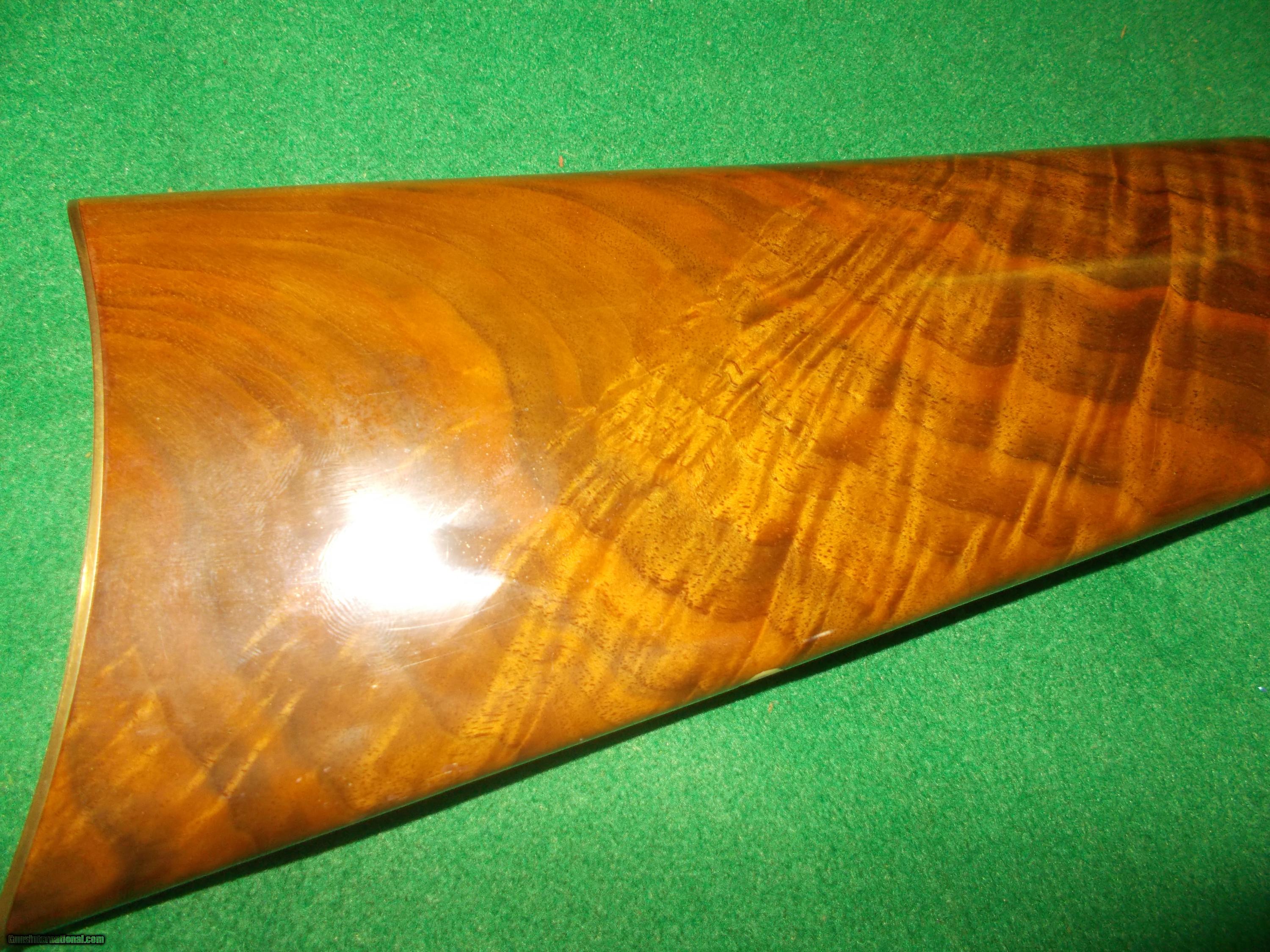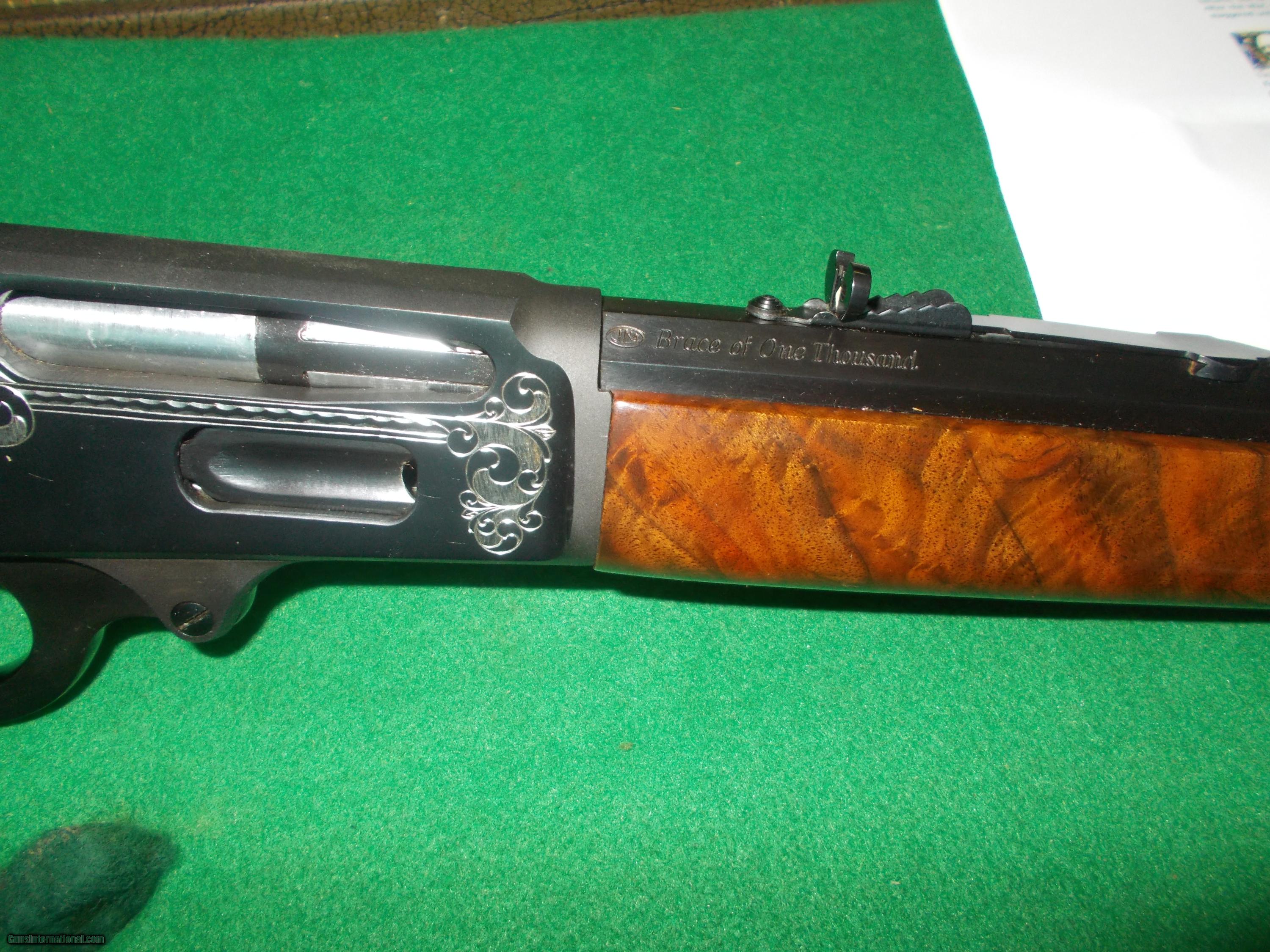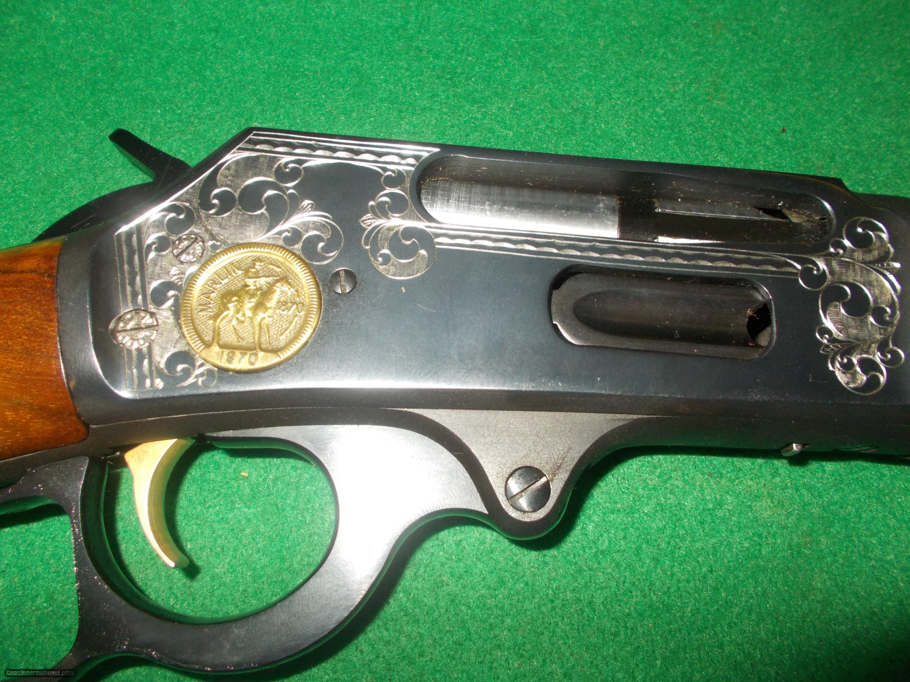 Description: 20" octogon carbine bbl., extensuve brass accents including forearm band & creseant butt, hand engraved bordered fluer 'd lei receiver of American Bison on western prarrie, finest of stump American walnut stock & forearm with receiver madallion cowbay astride his pony, commerating 100 yr. milestone anniversary, original Presentation Marlin display case, paperwork included This rifle is a true knockout) only: SOLD |