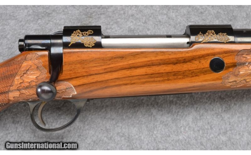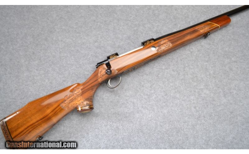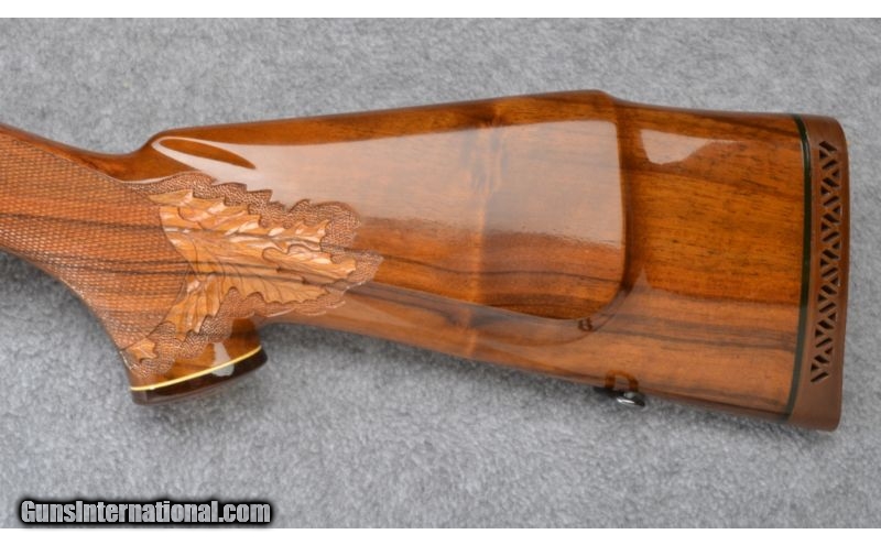 Description: Buttstock has a couple storage marks on the right side. Remainder is excellent throughout. No box. SOLD Manufacturer: S/N C7XX Caliber Info: 7 MM Rem. Mag Metal Condition: Excellent Wood Condition: Very Good Bore Condition: Excellent Barrels: 24 1/2 Triggers: Sako Stock: Checkered & Carved Walnut Pistol Grip with Contrasting Cap Stock Dimensions: 13 7/8" LOP Fore End: Checkered & Carved Walnut with Contrasting Cap Butt Pad: Brown Vented Rubber Weight: 8 LB Sights: None Item Location: Wheeling, WV |