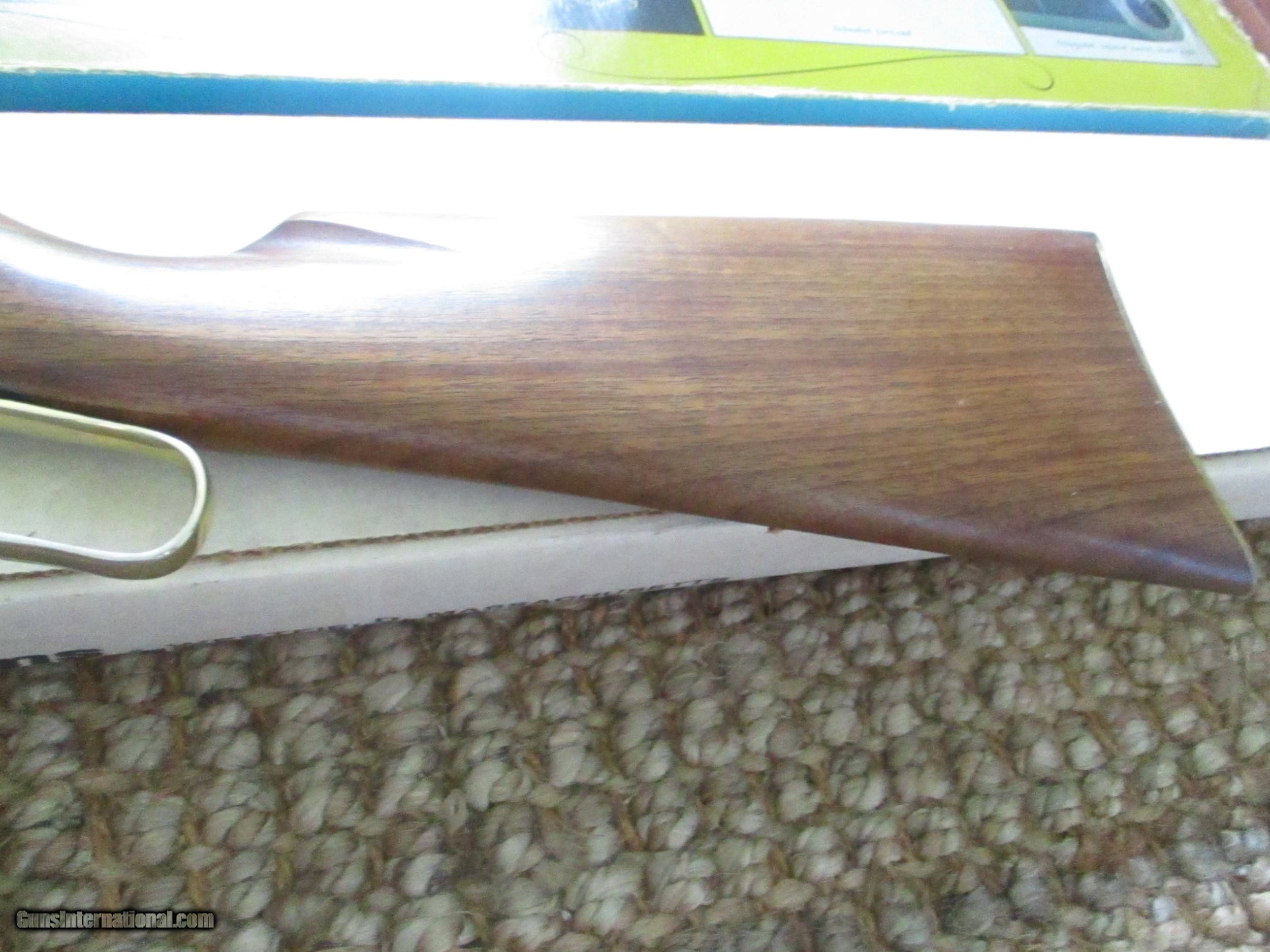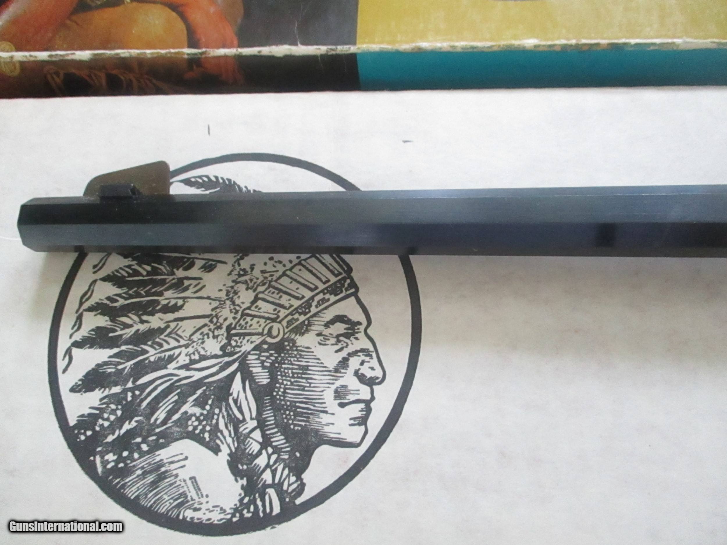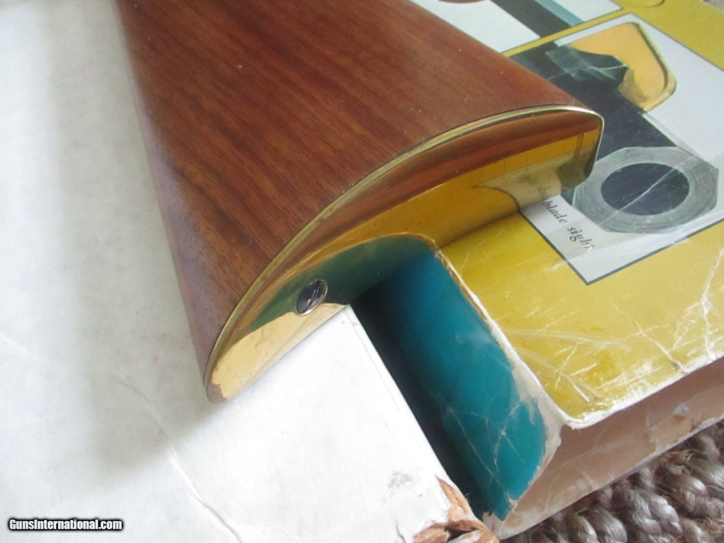 Description: 24" octogon bbl., 24kt engraved receiver, gold plated receiver & accents, straight stock, schnabel forend American Indian chief medallion in stock commerating anniversary model of 75th yr., brass creseant buttplate, unfired in box, outside pictured dislay cover, with all paperwork & manual: SOLD |