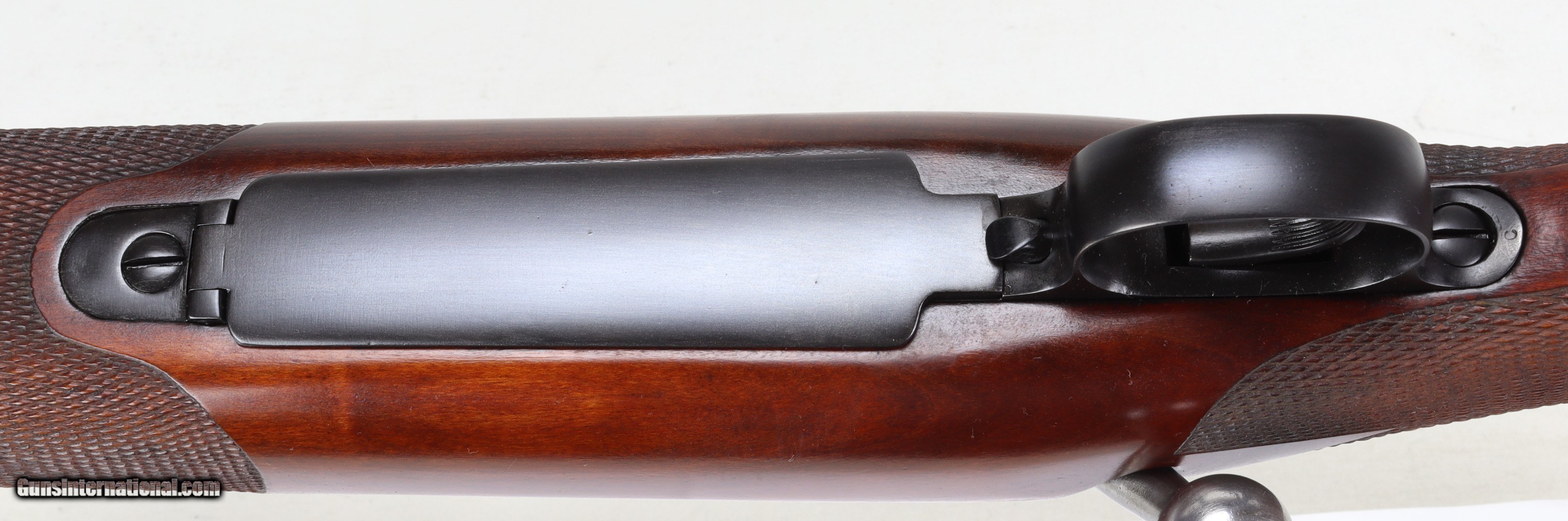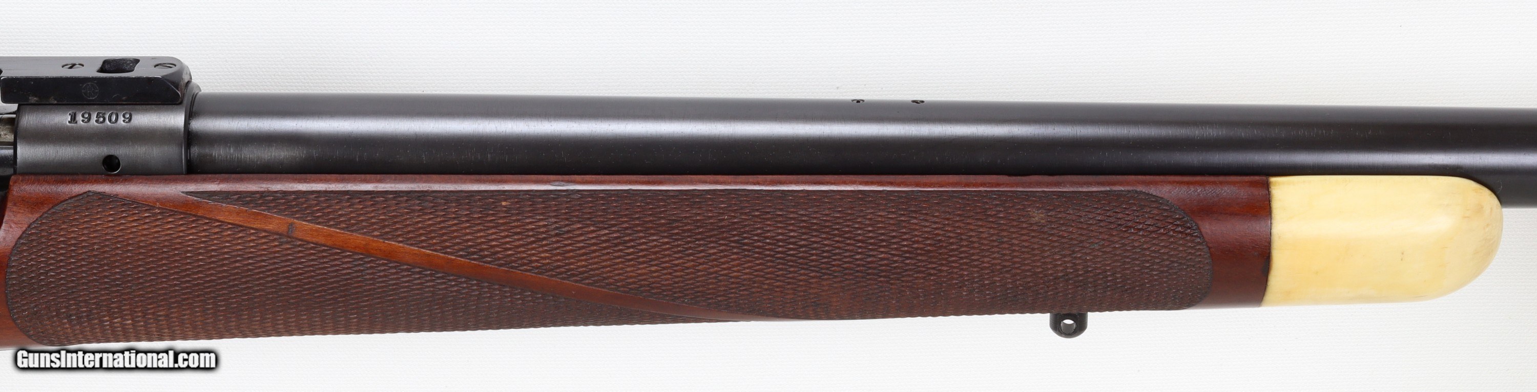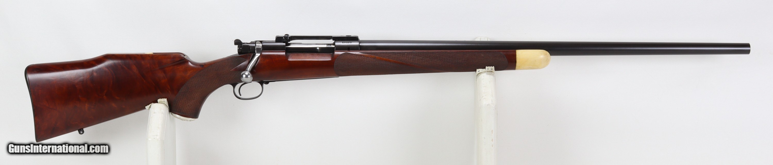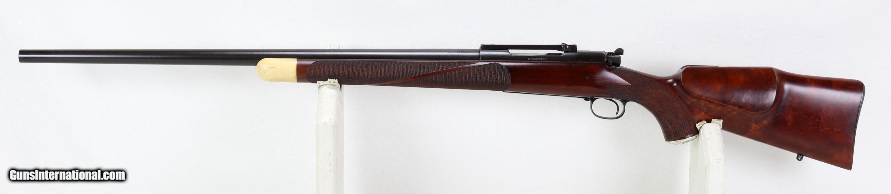Description: WINCHESTER Model 70, Pre-64, SN# 19509, Mfg: 1939, .220 Swift, 26" Heavy Douglas Barrel, Marked, H.W. Creighton, C P, (Creighton Proofed), Fitted by Nashville, Gunsmth in 1985. Stock is Custom English Walnut Stock w/13 3/8 LOP. , by Hal Hartley, Lenoir, NC in 1984, "EXCEPTIONALLY BEAUTIFUL", WITH IVORY FOREND, Beautiful Checkering, Sterling Silver Pistol Grip Cap. The Butt Plate is Checkered, and has a Cleaning Kit Pocket. Original Sights Removed, and has Redfield Scope Base, Excepts Twist on Rings. This in an "EXCEPTIONAL TARGET RIFLE, BEAUTIFUL AS WELL. Ships to Lower 48, with Insurance: $100.00 Weight: 11lbs, Trigger Pull 1 1/2 oz, Minimum Travel. The Barrel and Receiver have been Re-Blued. ADDITIONAL PICTURES AVAILABLE ON REQUEST. Sold pending Receipt of Funds SOLD Curio/Relic: Yes |
