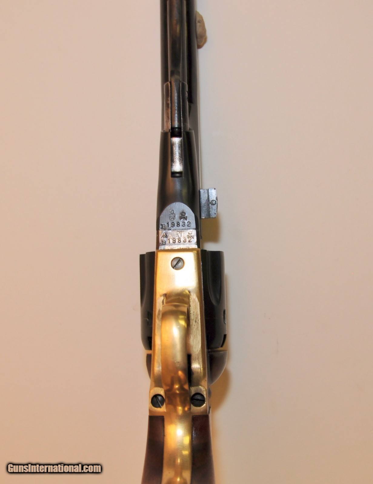 Description: 36 caliber. SN B19832. 5-1/2" round barrel. Brass blade front sight. Fluted 6 shot cylinder. Blue finish with case colored frame, hammer & trigger. Brass trigger guard & backstrap. 1 piece walnut grip. Mfg. in Italy. Very good used conditon. Over 95% metal finish. Grips show small handling marks. Bright near excellent bore. shipping $20.00 Credit card accepted with 4% upcharge. SOLD |