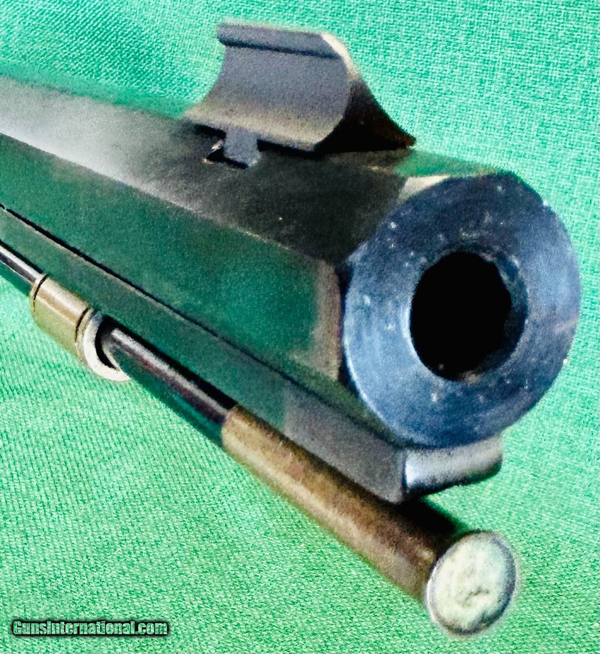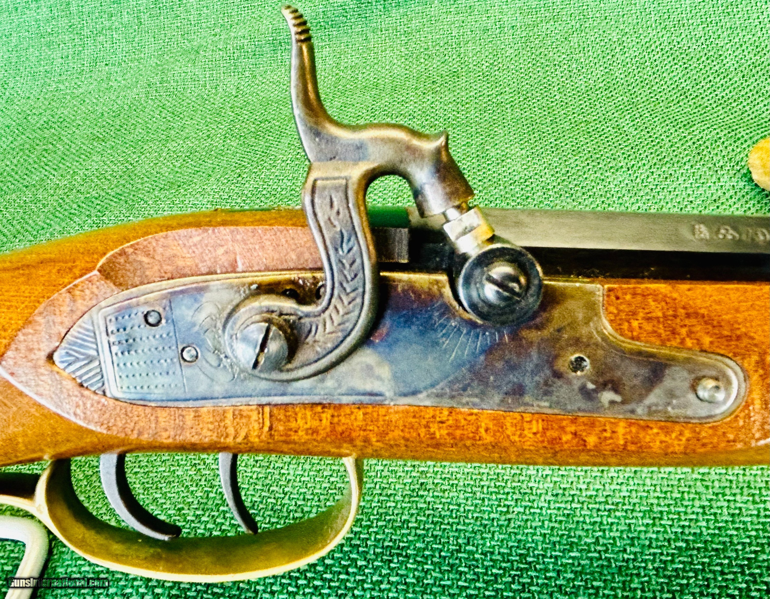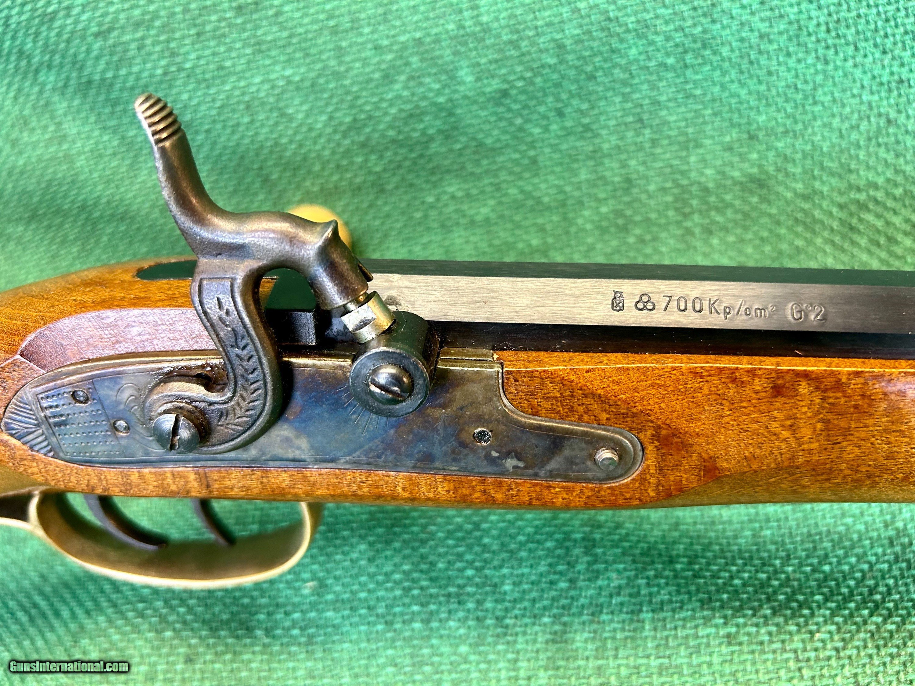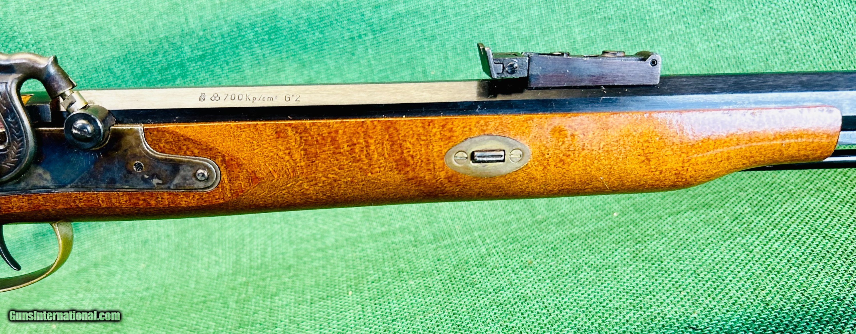 Description: Listed is a Connecticut Valley Arms black powder Squirrel rifle chambered in .32 caliber. This features a 3/4" across the flats octagonal barrel, double set trigger, percussion ignition, adjustable sights, ram rod, walnut stock, case hardened lock plate and hammer, and blue'd finish. The twist on these are 1:60, designed to use lead round ball. These rifles are lighter and compact making them a blast to hunt small game with or shoot mark. This one is in excellent shape. There is little if any evidence of being fired. Bluing and case color are excellent. Set triggers work as they should. We accept USPS Money Order or cashier’s check for immediate shipping. Shipping costs are actual postage to your door, no FFL required. We will pay the insurance for the amount sold. All items are for sale locally, so make contact as soon as you make your decision. SOLD Rifle Caliber: .32 Manufacturer: Connecticut Valley Arms Model: Squirrel Condition: Excellent Bore Condition: Excellent Triggers: Set |