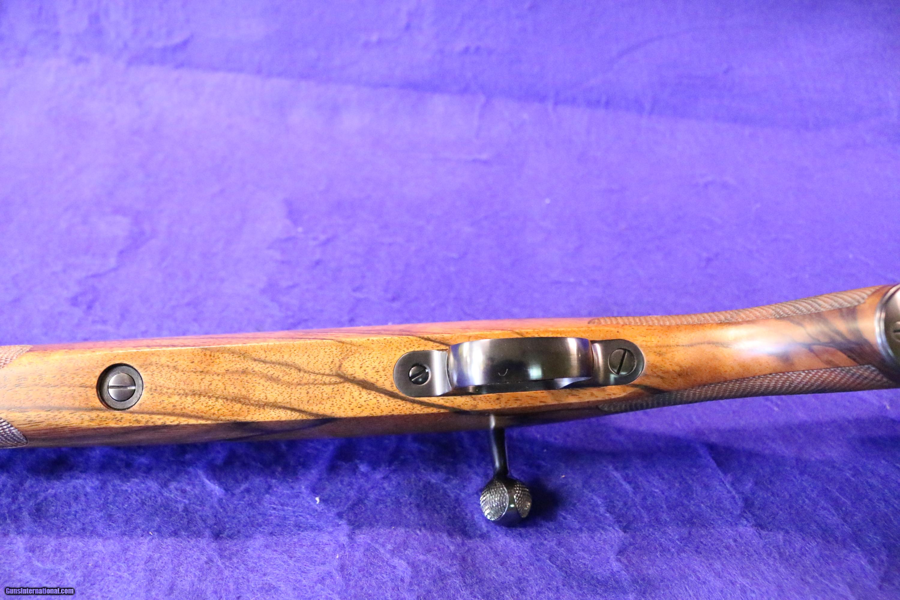 Description: 1995 Cooper Arms Model 22 in 22-250 this was the featured rifle at the 1996 Shot Show held in Dallas Texas 1/11-1/14 1996. It was also the 1996 Cooper catalog cover gun and the single shot and custom section pages. This rare rifle bears number 1 of 25 and as such is the first of 25 rifles that were manufactured as a special edition in the fall of 1995. This exquisite rifle shows true exhibition quality French walnut. The action is polished to a fine royal blue. It is the first gun to have the new 1996 checkering pattern that was developed by Bernadette Duckette & Mary Ann Hackenbury. It is equipped with the Cooper-Jewell two stage trigger, a 3 panel checkered bolt knob, and Custom checkered skeleton grip cap and butt plate. Remaining in new unfired condition the rifle includes a Cooper Arms factory letter verifying all of the pertinent information, A 1996 Cooper Arms catalogue with this rifle pictured on the cover, A Nightforce 3.5x15x56 scope, and the original shipping box. Cooper Arms recently stated that cost to reproduce this rifle, without the special serial number, catalog cover, and scope would be a minimum of $8,600.00 SOLD |