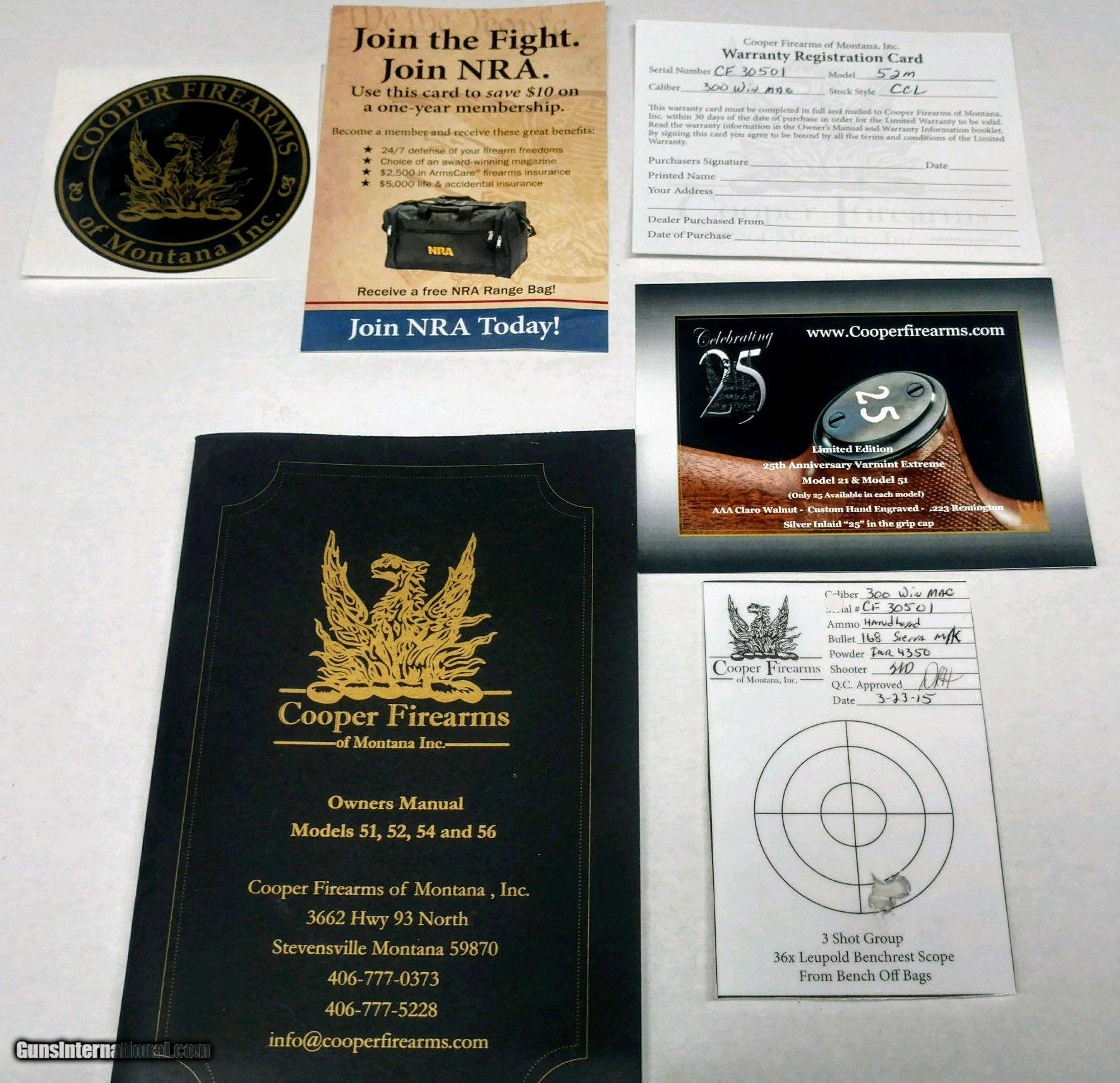 Description: This rifle will be the highlight of any collection. Cooper Arms model 52 Custom Classic in 300 Win Mag As you can see from the pictures, this is a gun for those of us who love beautiful wood. This is unfired, new in the box, and the face of the spiral fluted bolt looks so good, you'd swear it wasn't even test fired. Though as you can see on the test target, it shot a super tight group in the factory. Comes with the perfect combination of optional features that really put this rifle head and shoulders above the rest. Price dropped a thousand off MSRP for this week. Also would consider trades on Kimber Brownells or Kimber Africans. Optional Features Included: • AAA+ Grade Claro Walnut Stock • Custom 14" Length of Pull • Skeleton Grip Cap • Inletted Sling Swivels • Checkered Bolt Knob • Warne Scope Bases • 25" Barrel Length • Spiral Fluted Bolt Other Standard Features: • Shadowline Beaded Cheek Piece • African Ebony Tip • Western Fleur Wrap Around Hand Checkering • Hand-Rubbed Oil Finished Wood • Pachmayr® Pad • Steel Grip Cap • Chrome-Moly Premium Match Grade Wilson Arms Barrel • All metal work is High Gloss Finish SOLD Manufacturer: Cooper Arms Model: Model 52 Serial Number: CF30501 Caliber Info: 300 Win Mag Condition: Unfired, New In Box Metal Condition: New Wood Condition: Fantastic Bore Condition: Unfired Stock: AAA+ LOP: 14 Item Location: Kansas City, KS |