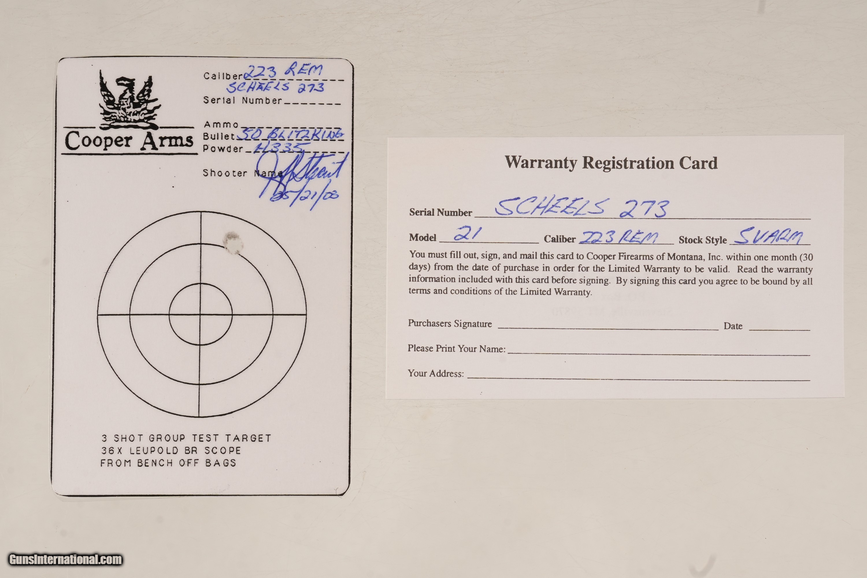 Description: Cooper Model 21 , Cal .223 Rem with 24" stainless Heavy Bbl,. Blue finished single shot receiver with oil finished target stock checkered at wrist. Comes in original shipping box with factory test target dated 05/21/08. Condition, Excellent with little or no actual use evident. Brilliant bright bore. Excellent stock. Mechanically excellent. • Free Shipping, No Credit Card Fees. • Lay-a-way available for this firearm. • 1/3 Down, a 1/3 in 30 Days, 1/3 in 60 Days. SOLD Manufacturer: Cooper Model: 21 Serial Number: SCHEELS273 Barrel Length: 24 |