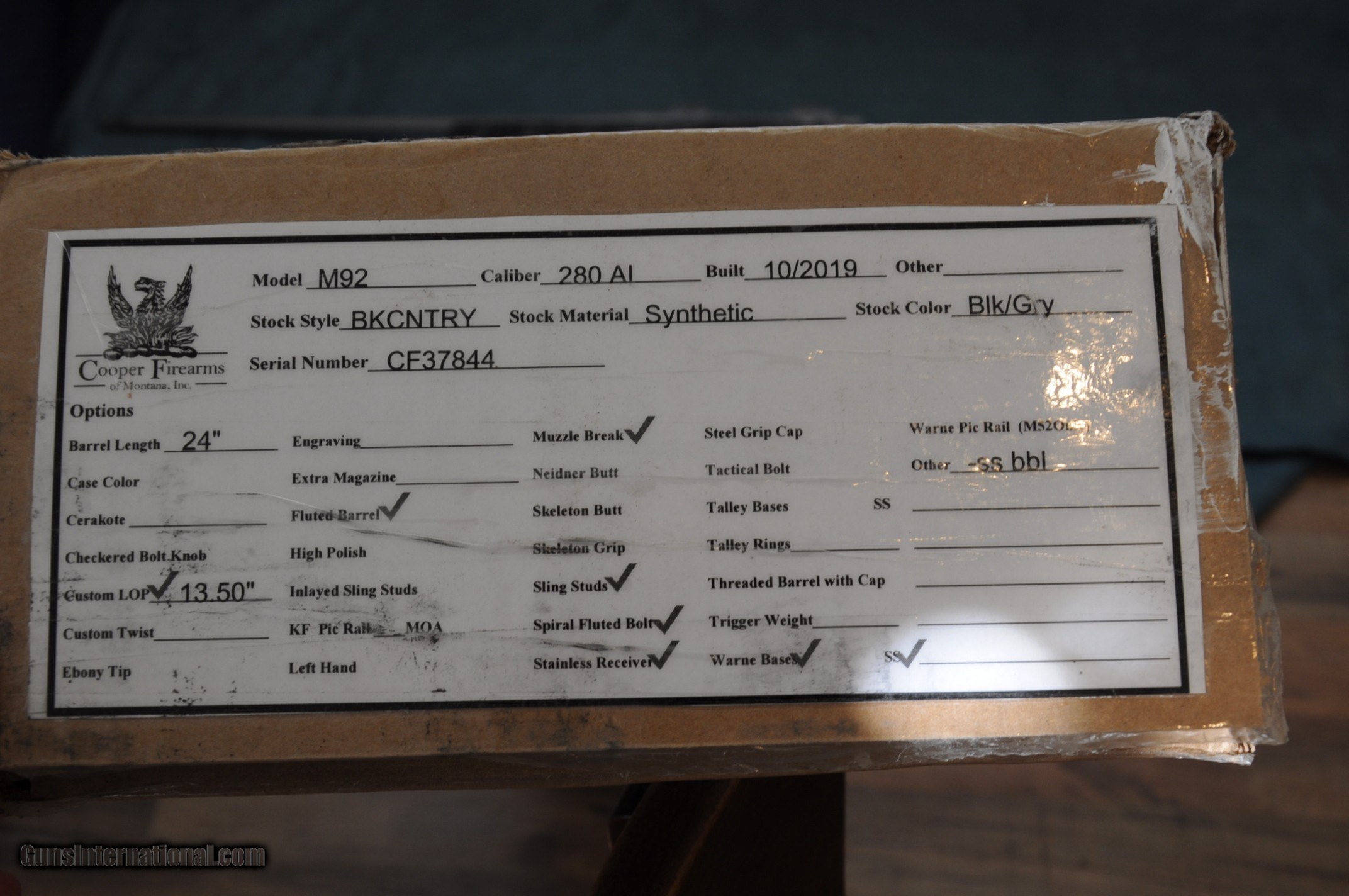 Description: Cooper 92 Back Country 280 Ackley Improved New in Box. Fluted Barrel, Spiral Fluted Bolt, Stainless Steel & Detachable Magazine. SOLD Manufacturer: Cooper Firearms Model: 92 Back Country Caliber Info: 280 AI Condition: New Barrels: 24" Fluted Stainless Steel LOP: 13.5" Length of Pull Extras: Warne Bases |