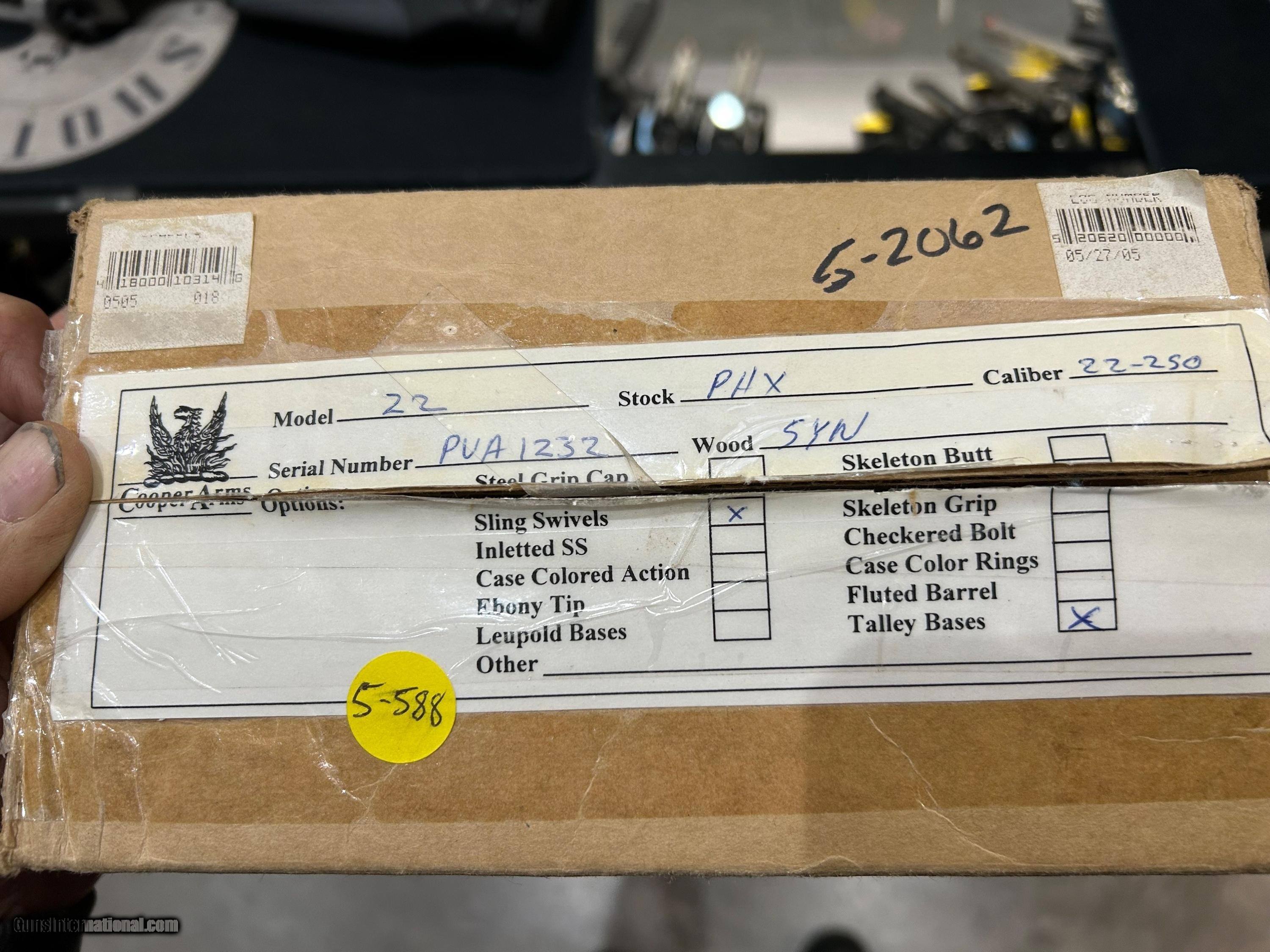 Description: Up for sale is a Cooper Arms Model 22 chambered in .22-250 Remington. This is a high-quality, American-made bolt-action rifle known for its exceptional accuracy and craftsmanship. This rifle features a stainless steel fluted barrel, a synthetic “Phoenix” style stock finished in a black with copper webbing pattern, and a matte blued receiver. The smooth action, crisp trigger, and quality fit and finish are everything you’d expect from Cooper Arms. This particular rifle is in excellent overall condition with only minor signs of handling. The bore is bright and sharp. Comes with Talley scope bases and rings installed. The original Cooper factory box and matching serial-numbered label are included (Serial #PVA1232). Specs: