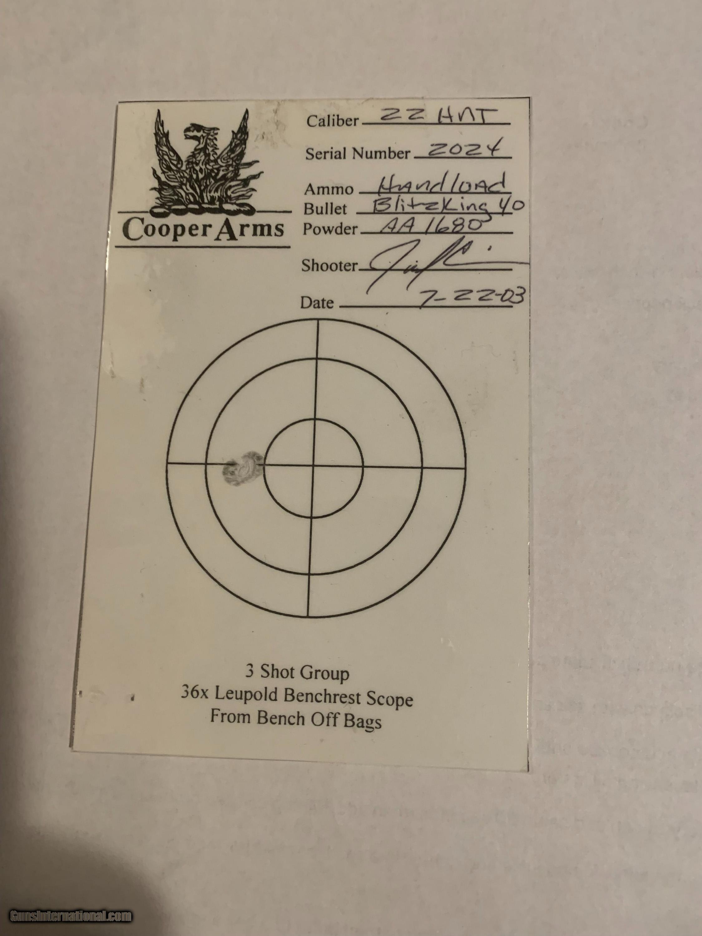 Description: Cooper Arms Model 38 in 22 Hornet, excellent condition with Nikon 6-18X40 side focus matte BDC scope. Bolt Action, Single Shot, AA Wood, Leopold bases, VR Stock and original Box. Buyer pays shipping cost, no sales to California. $2750.00 SOLD Rifle Caliber: .22 Hornet Manufacturer: Cooper Arms Model: 38 Serial Number: 2024 Condition: excellent Metal Condition: excellent Wood Condition: excellent Bore Condition: Bright Butt Pad: Rubber |