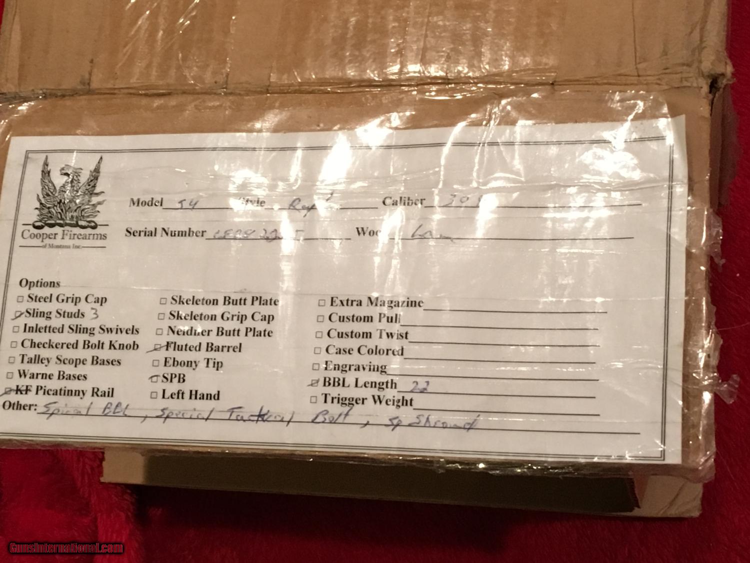 Description: Like new Cooper Firearms Model 54 Raptor 308 with 22" stainless spiral fluted barrel, muzzle brake, tactical bolt, gray laminated stock and Leupold VX III 6.5X20 matte scope. Beautiful gun that shoots one hold. In box with paperwork. Please add 3% if paying with a credit card. SOLD Manufacturer: Cooper Firearms Model: 54 Raptor Caliber Info: 308 Win |