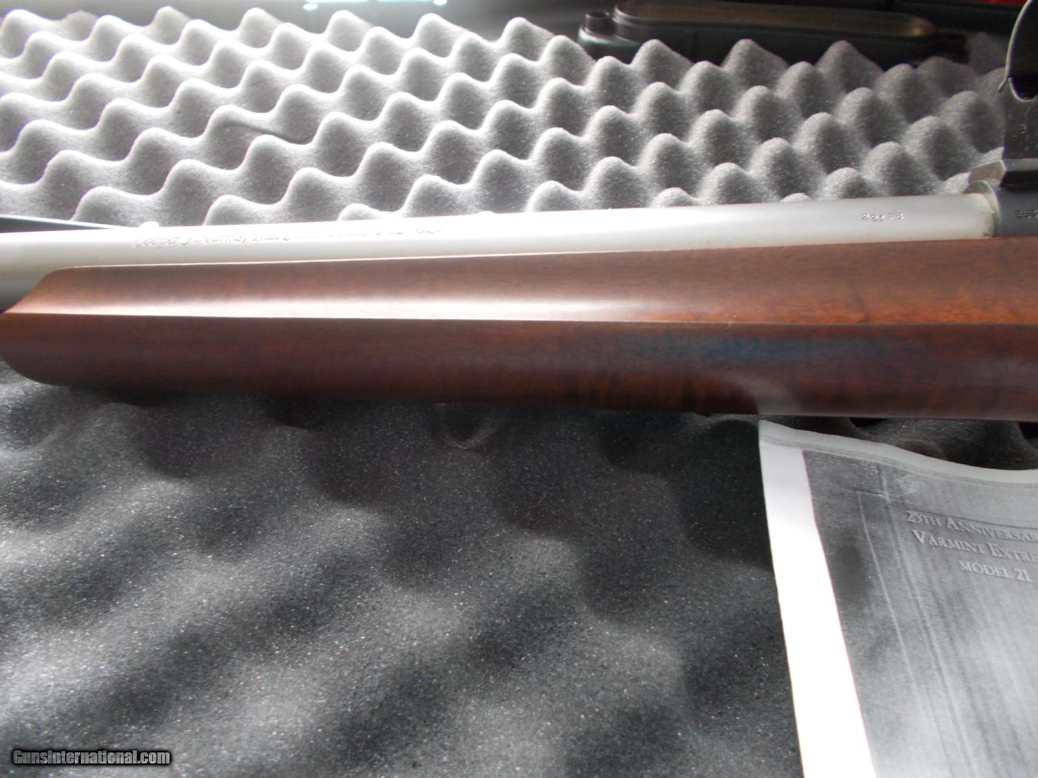 Description: 24" mette metal stainless steel varmit bbl., preminum grade hand checkered, oil fini9upgrade 0 select Carlo walnut, special order factory checkered 1/2" solid rubber pad, correct Weaver 1" med. high matte rings, as new condition in original box with paperwork, test target & shipping box cover SOLD |