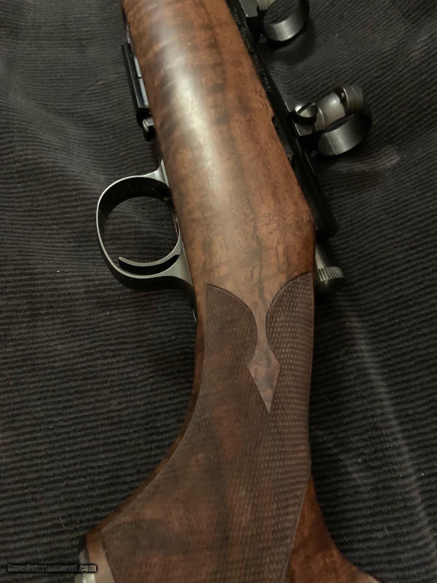 Description: ***SOLD*** Cooper 57M .22 mag. Beautiful upgraded wood. Knurled bolt knob. 21.5" barrel. believe the rifle is unfired. One very small impression in the wood on the right side of the rifle below receiver. It can be seen in the last photo. Scope not included but rings and bases are. Test target and box included. FFL must accept transfers from an individual. SOLD Manufacturer: Cooper Model: 57M Caliber Info: .22 Magnum Condition: LNIB |