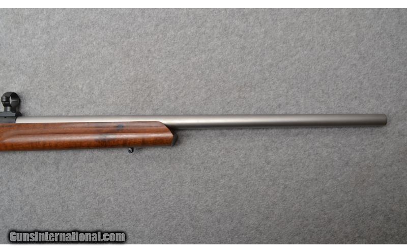 Description: Cooper Model 21 .223 Remington with 24" stainless steel varmint weight barrel and recessed target crown. Leupold two piece base with one inch rings. The bore is bright with strong rifling. Action and bolt handle show some light handling marks though none are through the finish. Stainless steel barrel shows a few light rub marks. Walnut stock and fore en have a few light handling marks and scratches though none are through the finish. .223 Remington SOLD Metal Condition: Action and bolt handle show some light handling marks though none are through the finish. Stainless steel barrel shows a few light rub marks. Wood Condition: Walnut stock and fore end have a few light handling marks and scratches though none are through the finish. Bore Condition: Bright bore with strong rifling. Barrels: 24" stainless steel varmint weight barrel. Stock Dimensions: 14" LOP Fore End: Walnut bench rest style fore end. Butt Pad: Factory thin black rubber recoil pad. Sights: Leupold two piece bases and one inch rings. Item Location: Mitchell, SD |