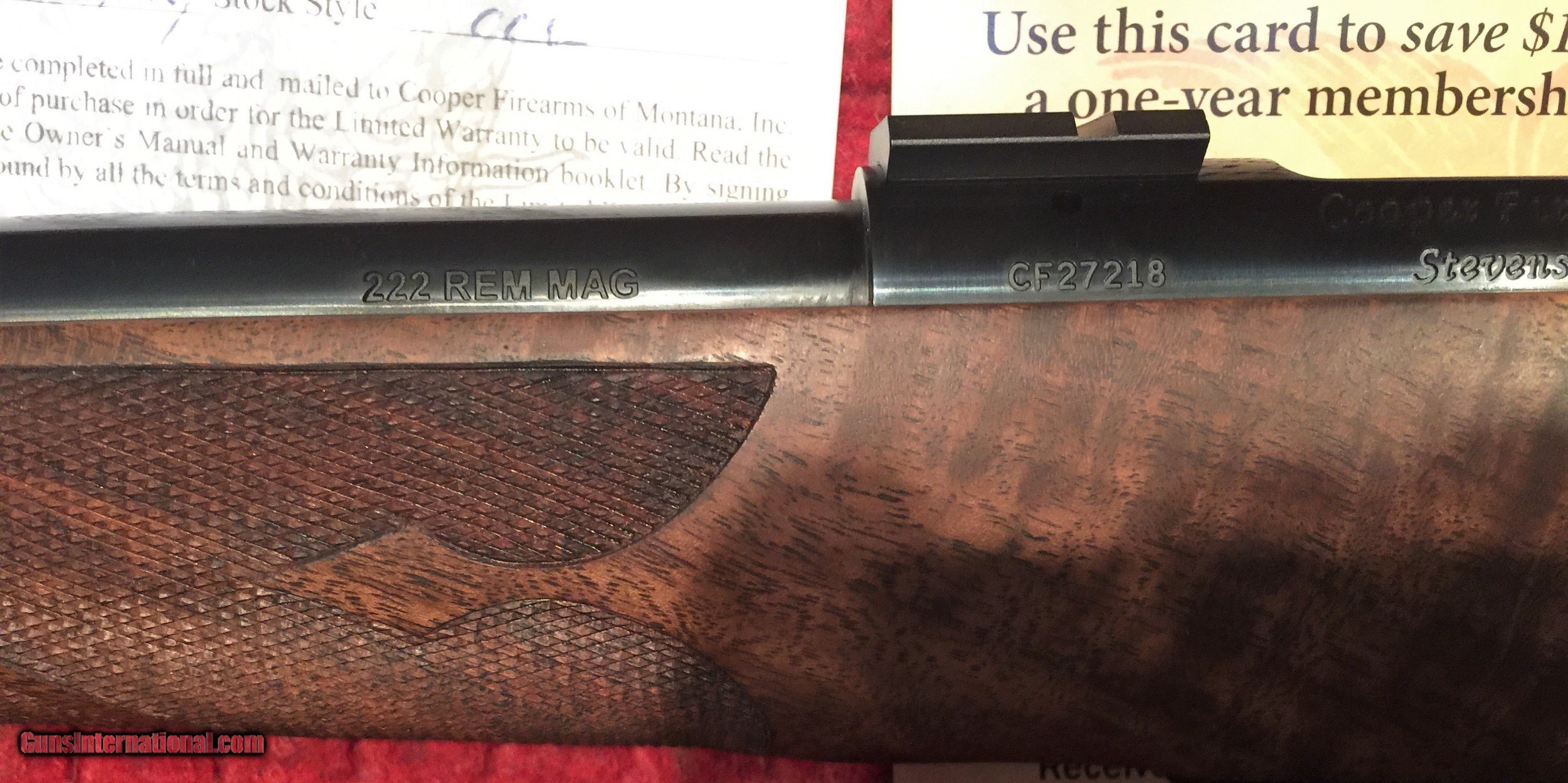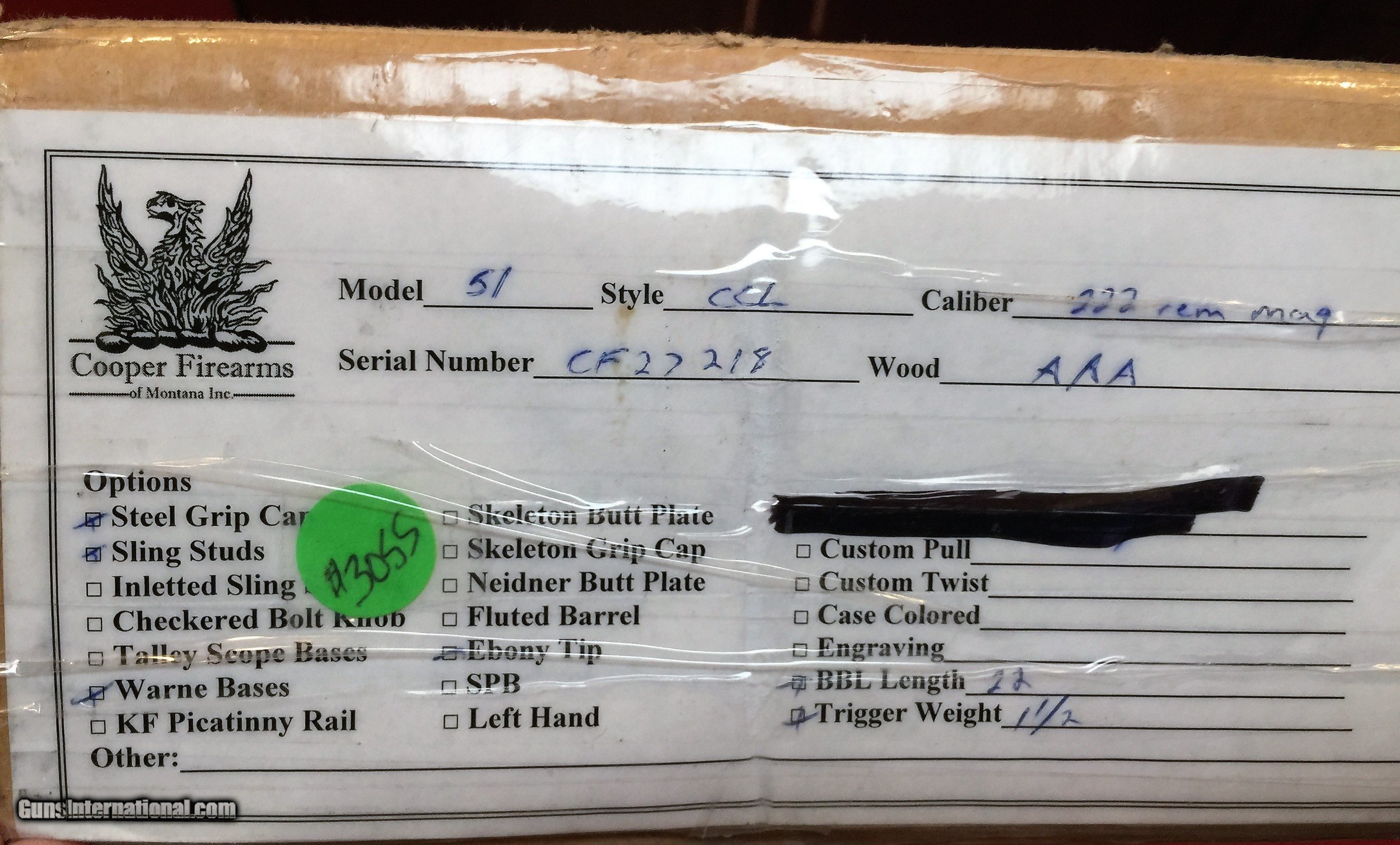 Description: NEW IN THE BOX COOPER FIREARMS CUSTOM CLASSIC MODEL 51 REPEATER IN RARE .222 MAGNUM. PRETTY RIFLE WITH NICE WALNUT AND TALLEY SCOPE BASES ATTACHED. ***PENDING FUNDS*** SIH TO YOUR FFL INCLUDED WITH THE PRICE. SOLD |