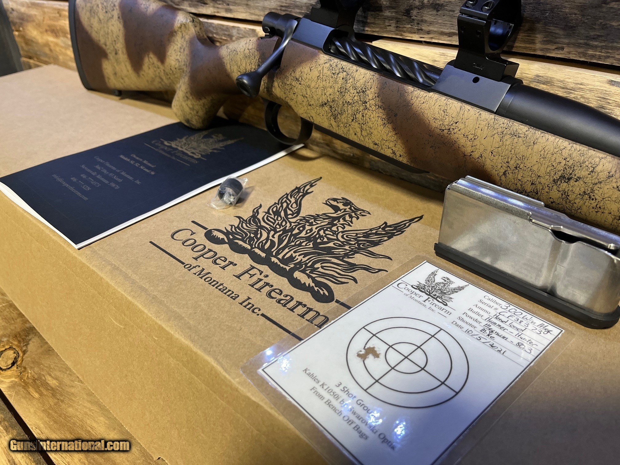 Description: Cooper Fireams of Montana Model 92 Backcountry 300 Win Mag 24" Stainless Barrel w/ Radial Muzzle Brake and Thread Protector (Graphite Black Cerakote) Stainless Action (Graphite Black Cerakote) Tan and Brown Desert Camo w/ Black Webbing 2 Mags 30mm Talley Rings Original Box, Paperwork and Test Target Excellent Condition SOLD Rifle Caliber: .300 Winchester Magnum |