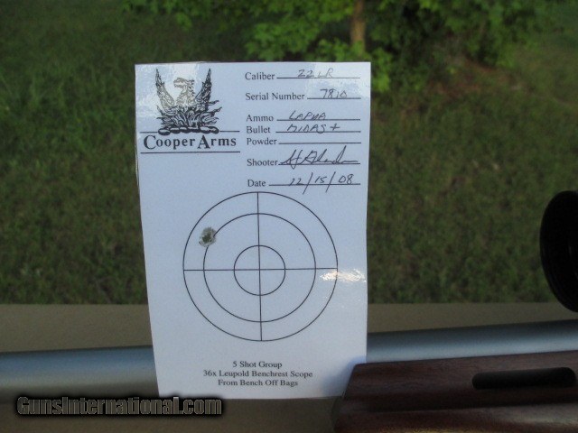 Description: This is a real nice Cooper 57m LVT 22lr. The rifle has a bright and shiny bore, the recess crown, the barrel, the wood stock, all in good shape. The trigger is at about 12oz.pull. This rifle works like it's supposed to. This is a left handed rifle. And I'm a right handed shooter. but i had no problems with it. This rifle ships in it's original box. You'll be happy with this rifle. The weaver scope does not sell with rifle. This rifle will ship to your FFL. for $35.00 If your FFL. dealer won't accept from a private party, then add $20.00 to cover transfeer cost. sorry no sales to California. Call 573-783-1905 leave message and phone # Thanks for your interest. ( Sold Pending Funds. ) Thanks. SOLD Rifle Caliber: .22 Long Rifle Manufacturer: Cooper Model: 57m Barrel Length: 24 Bore: real good Condition: real good Metal Condition: real good Wood Condition: real good Bore Condition: real good Action: Bolt action with 5 round clip Item Location: Southeast MO. |
