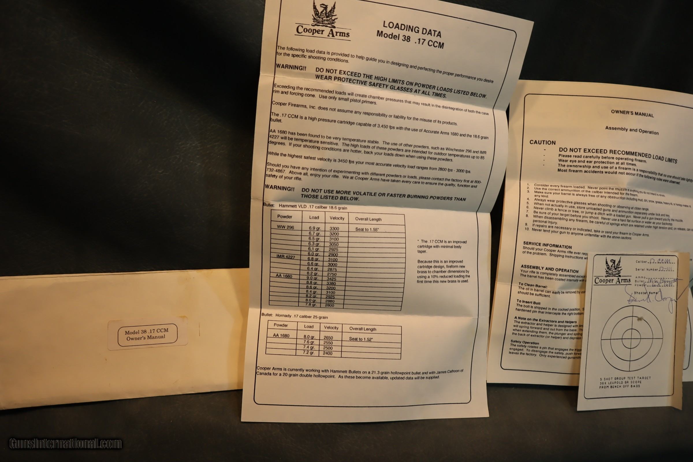 Description: Cooper Model 38 Custom Grade 17CCM Repeater,24" stainless barrel,fine bore,AA French Walnut stock with Monte Carlo cheekpiece,comes with RCBS dies and brass,box,papers and test target signed by Dan Cooper. GUN COLLECTIONS WANTED FOR CASH! We buy, sell, consign and trade new and used firearms. This is our 48th year in business. We offer 90 day layaways with 20% down. No return on layaways. Firearms will need to be transferred through a FFL dealer. Prices reflect a cash discount. There will be 3% added to credit card sales. We trade for gold and silver. THANK YOU! SOLD |