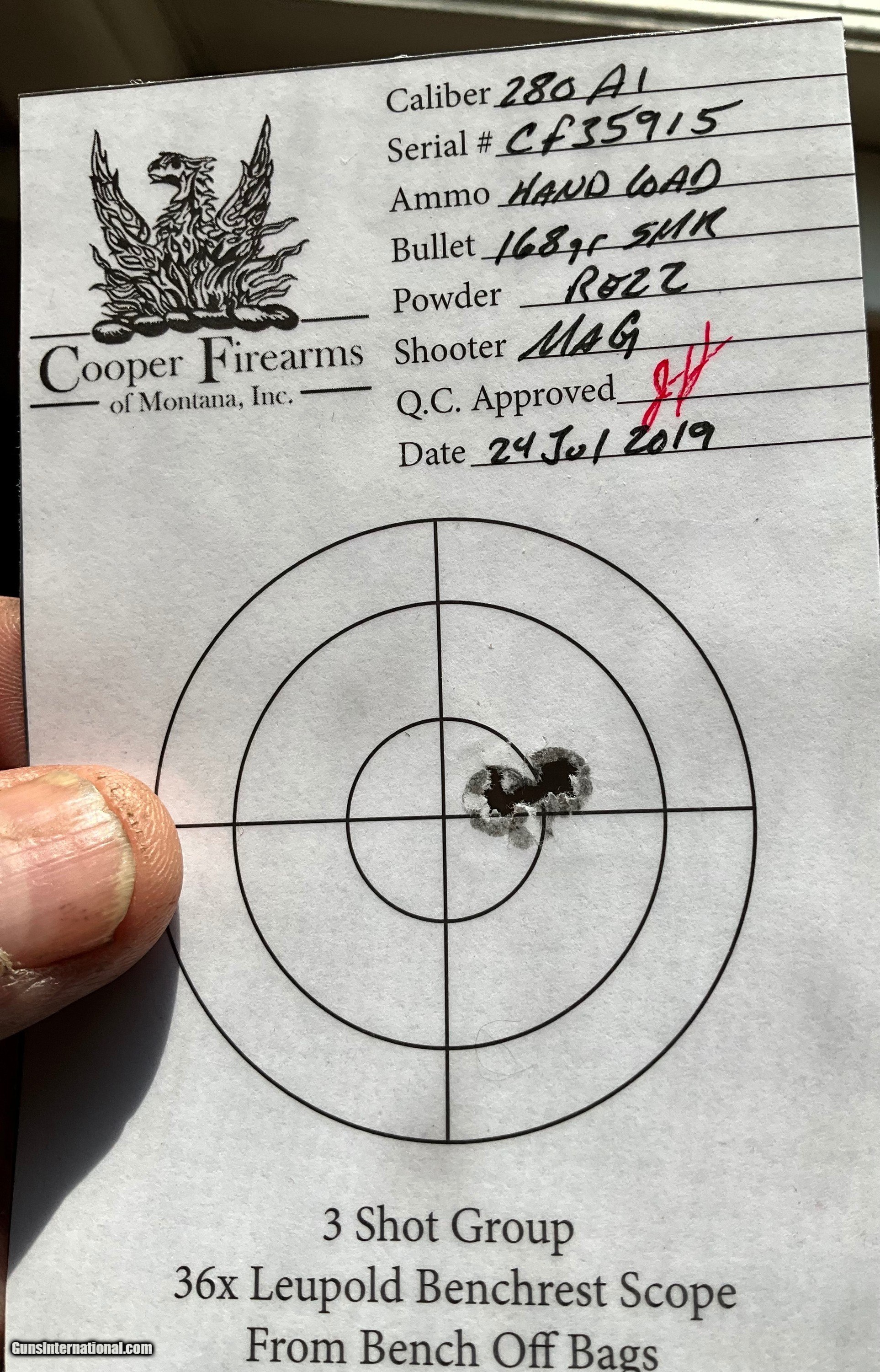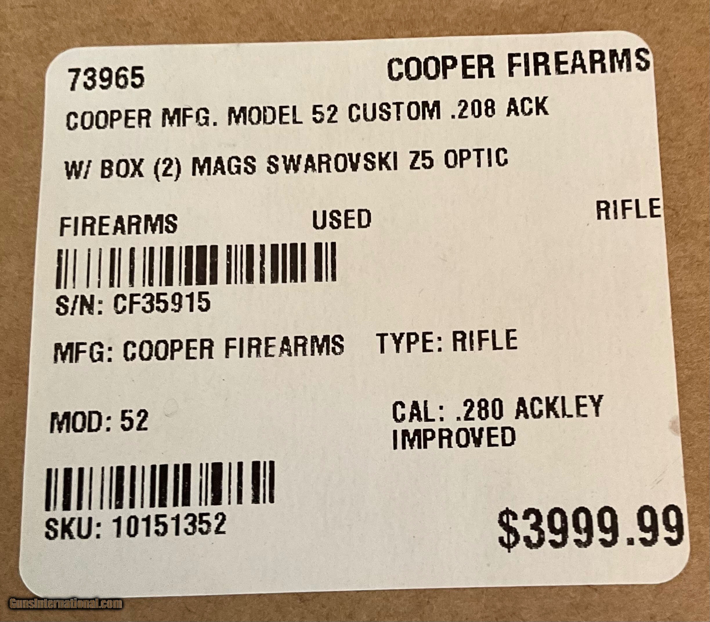 Description: Cooper 280 Ackley improved. excellent condition With box. Shoots excellent. 'Swarovski Z5 scope 3x -18x (scope retails $1500) excellent condition. 2 stainless magazines 4 boxes of nosler ammo. Shipping and insurance $50. SOLD Rifle Caliber: .280 Ackley Improved Manufacturer: Cooper Model: 52 Condition: Exc Metal Condition: Exc |