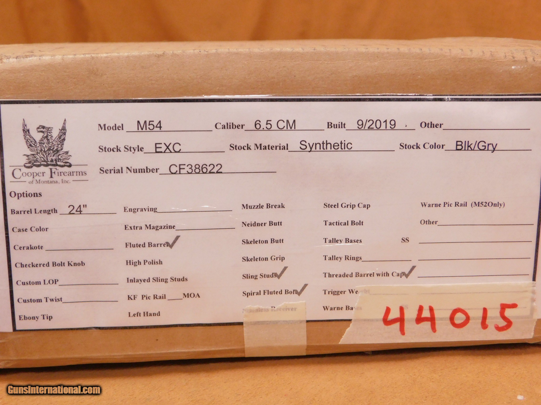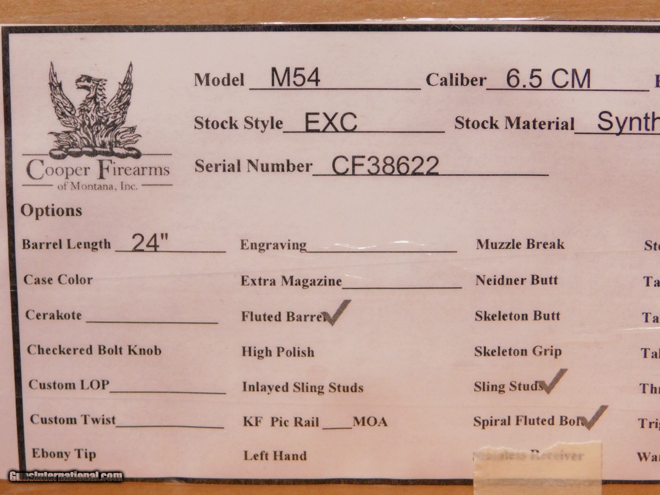 Description: This is a factory new, straight-from-Cooper Model 54 Excalibur. It is chambered in 6.5 Creedmoor with a 24-inch, fluted and threaded barrel. It also features a spiral-fluted bolt. The stock is black with grey splatter and has two sling studs. All items are also available for sale in our brick & mortar store and are subject to prior sale. Think long, think wrong. Payment On firearms, we typically only accept credit cards or money orders/cashier's checks.
