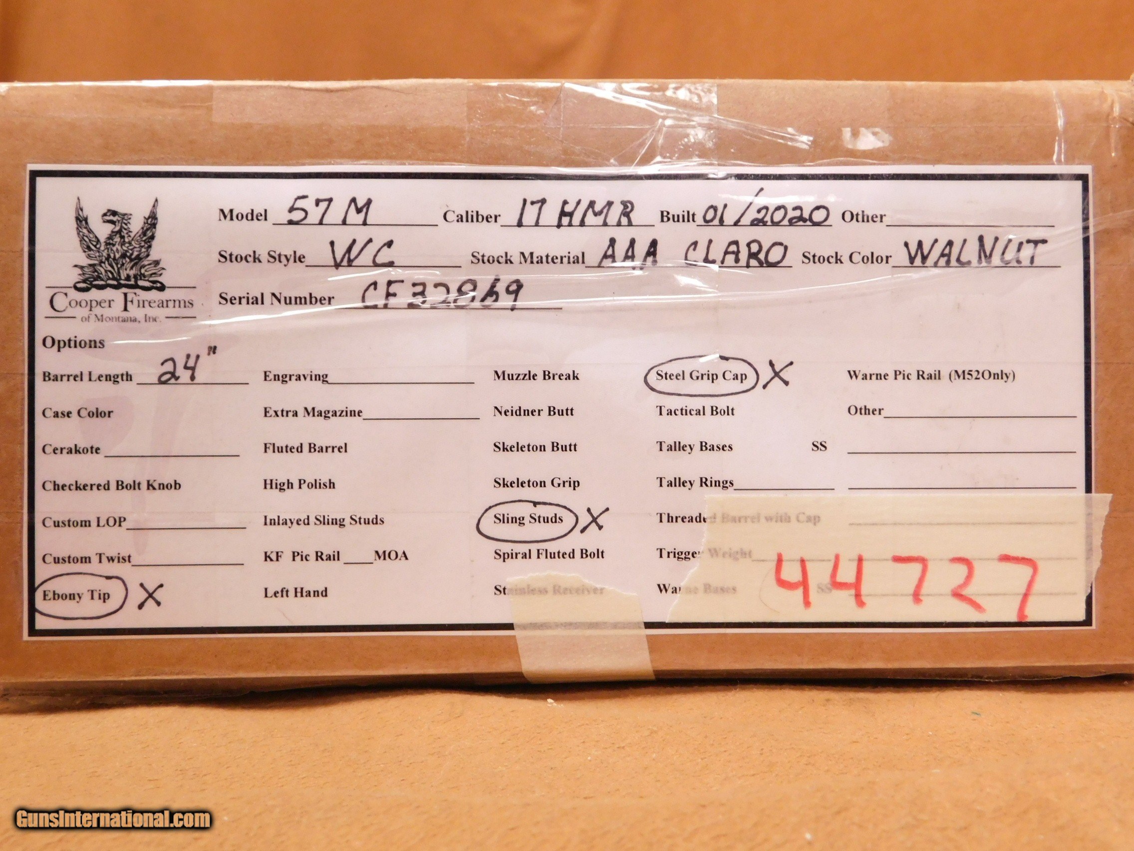 Description: This is a factory new, extremely pretty Cooper Model 57M Western Classic. It is chambered in .17 HMR with a 24-inch, octagon barrel. The stock is AAA Claro Walnut with a shadow-line cheeck piece, an ebony top, a steel grip cap, and two sling studs. The receiver, bolt handle, trigger guard, grip cap, and sling studs all feature vibrant case-coloring. All items are also available for sale in our brick & mortar store and are subject to prior sale. Think long, think wrong. Payment On firearms, we typically only accept credit cards or money orders/cashier's checks.