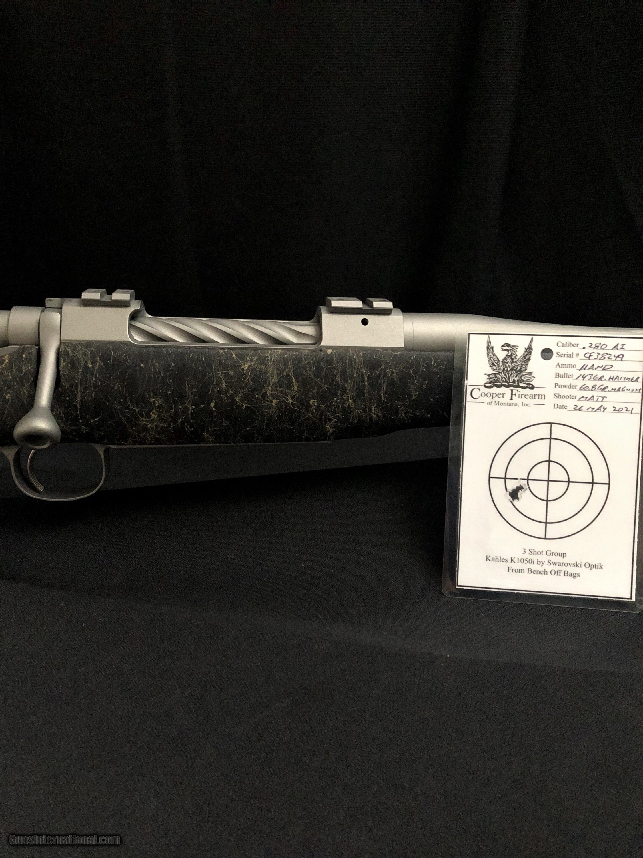 Description: Cooper Model 92 Backcountry in 280 Ackley Improved. The perfect mountain rifle at 5-3/4 pounds withd titanium colored Cerakoted metal. Adjustable trigger, 24" fluted barrel (25-1/2" with included muzzle brake), spiral fluted bolt, LOP 13-5/8". $3695. Buyer pays shipping. SOLD Rifle Caliber: .280 Ackley Improved |