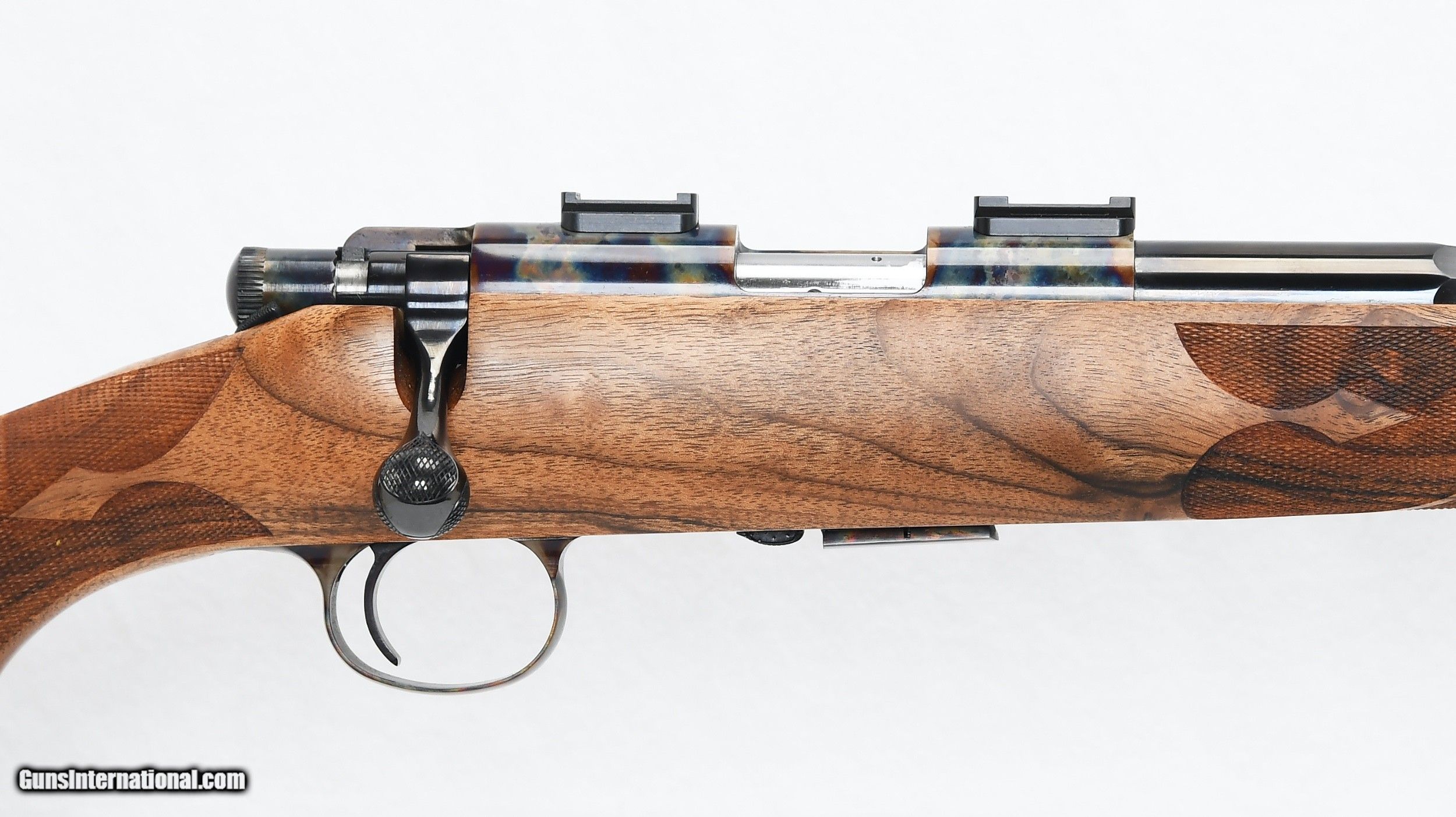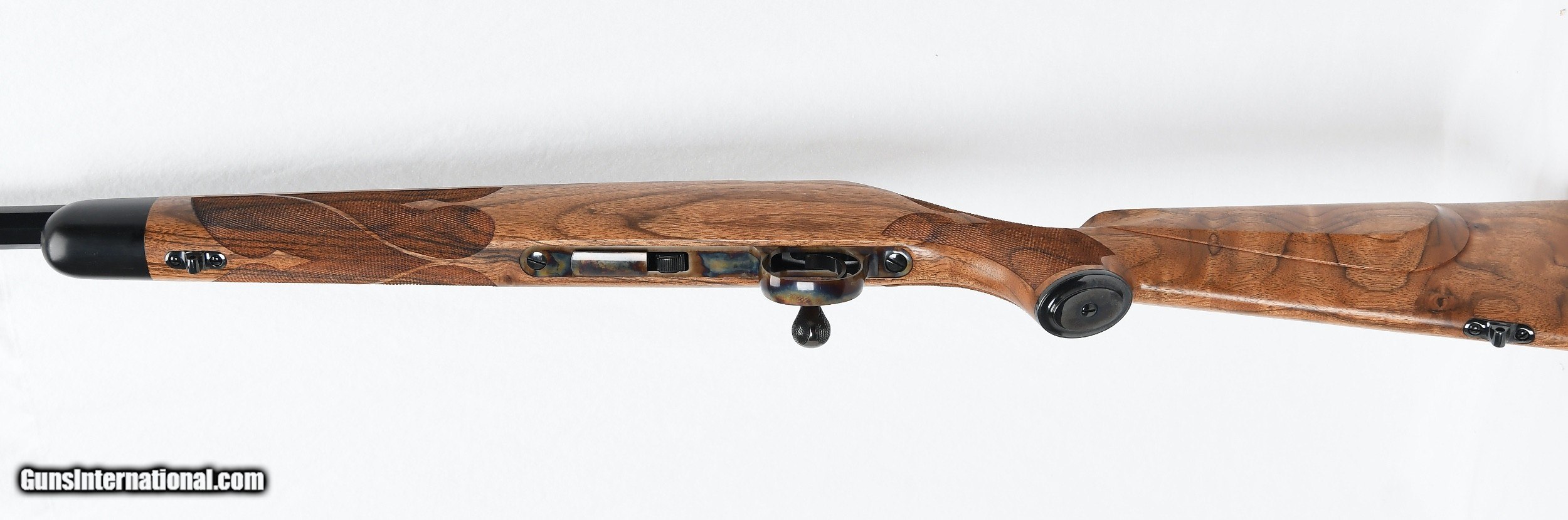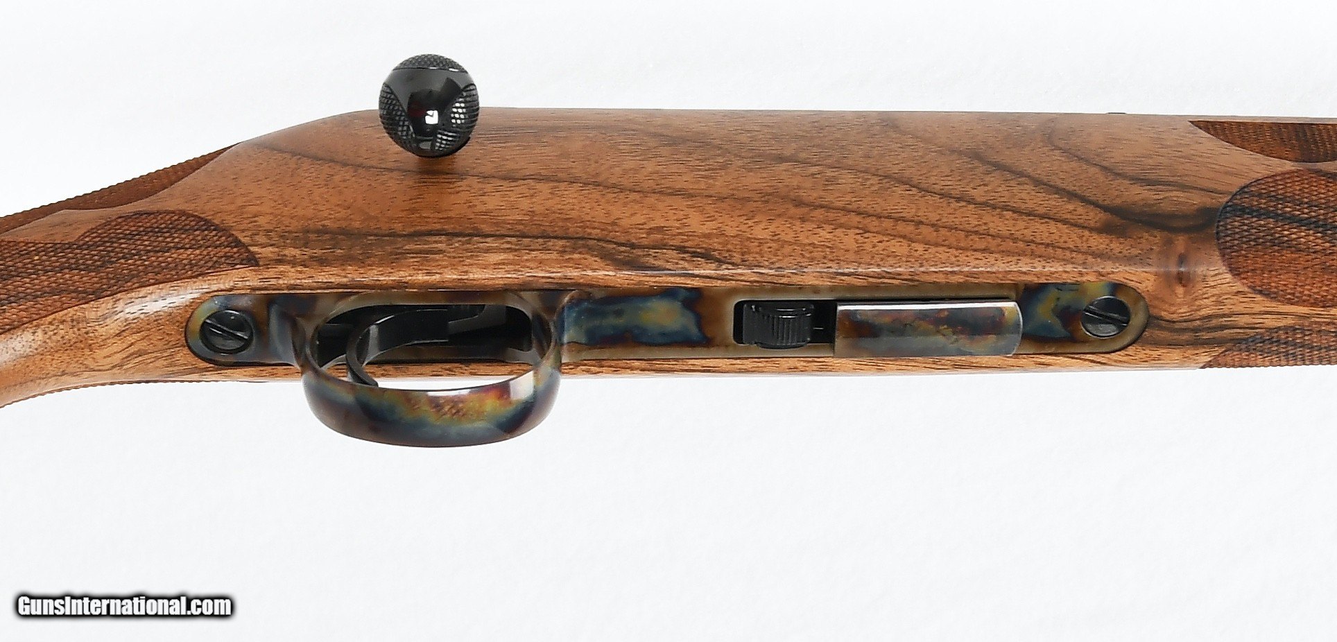 Description: Cooper M57 Western Classic .22 lr. Bolt action rifle. The Western Classic is the “top” of the Cooper line..Cooper’s ½ moa accuracy and extremely fine embellishments makes it a very desirable .22 lr. Rifle. Some of the features are: Bone case colored action, bottom metal, magazine bottom, and scope rings. The 24” octagon barrel, checkered bolt knob, inletted swivel studs, Neidner checkered steel butt plate and steel grip cap all in a beautiful high-polish blue. The spectacular piece of AAA+ Claro Walnut that was selected for the stock has a shadow line cheek piece, ebony forearm tip and wrap around Fleur-de-lis checkering with a 13 3/4” LOP. The rifle is perfect and in absolutely NIB condition. Box, paper work, target, warranty card and rings come in the original box. $4,150.00 SN: 1394 SOLD |