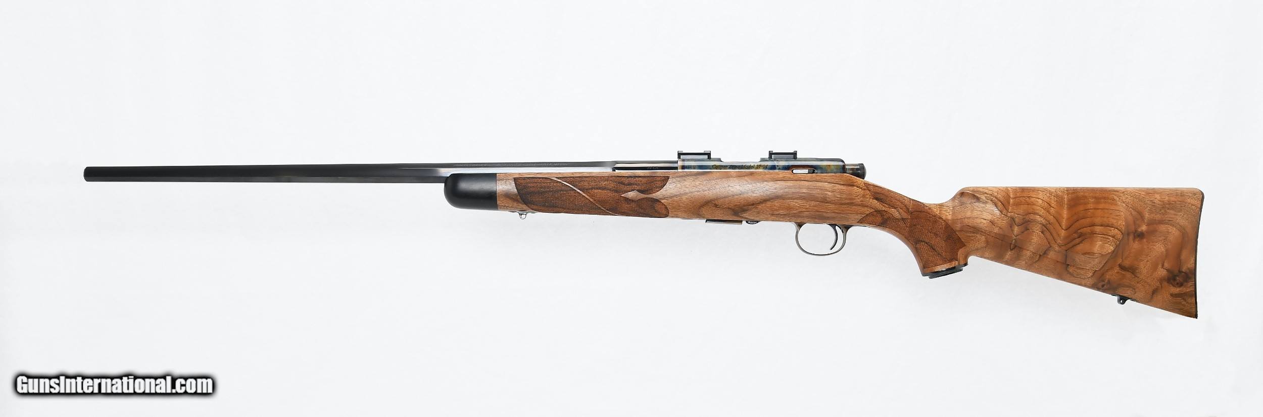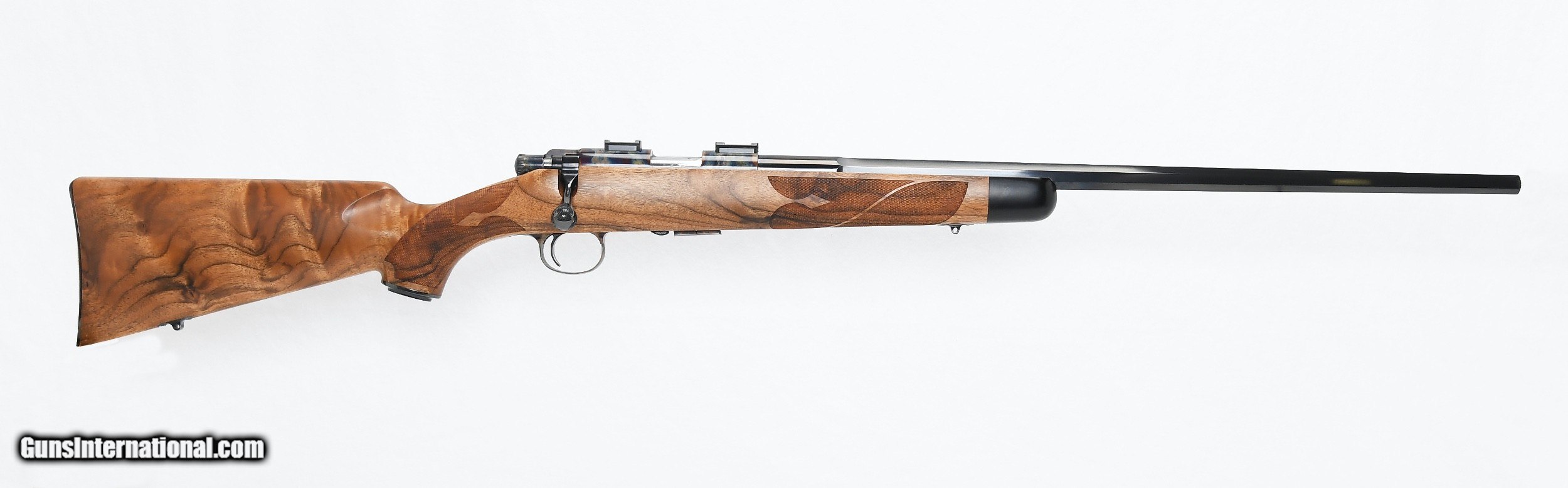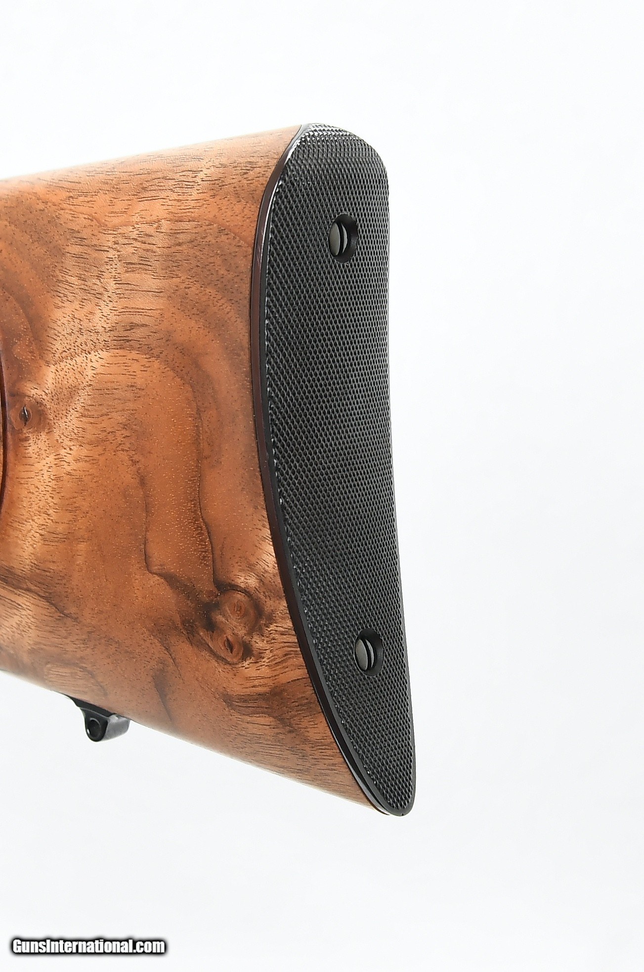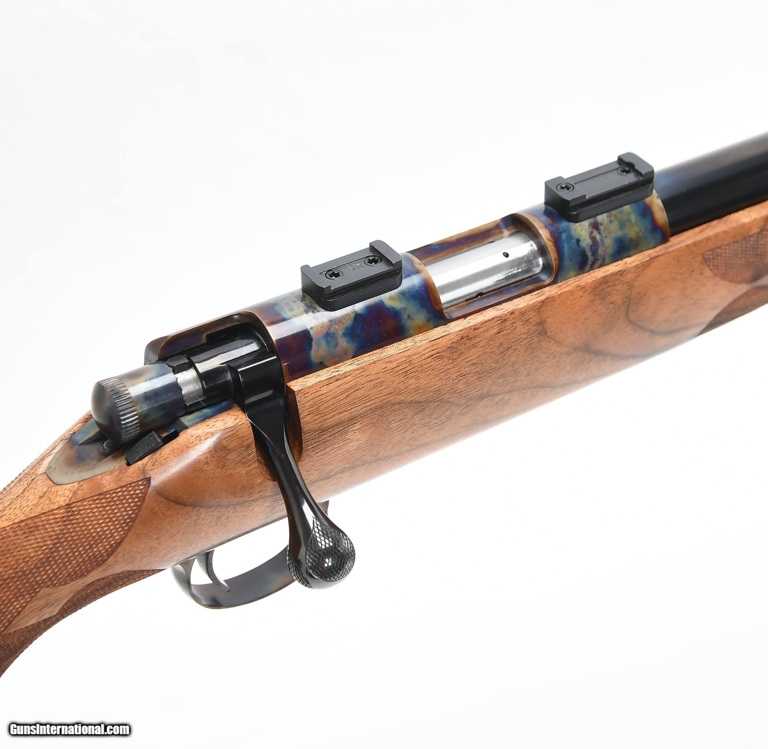 Description: Cooper M57 Western Classic .22 lr. Bolt action rifle. The Western Classic is the “top” of the Cooper line..Cooper’s ½ moa accuracy and extremely fine embellishments makes it a very desirable .22 lr. Rifle. Some of the features are: Bone case colored action, bottom metal, magazine bottom, and scope rings. The 24” octagon barrel, checkered bolt knob, inletted swivel studs, Neidner checkered steel butt plate and steel grip cap all in a beautiful high-polish blue. The spectacular piece of AAA+ Claro Walnut that was selected for the stock has a shadow line cheek piece, ebony forearm tip and wrap around Fleur-de-lis checkering with a 13 3/4” LOP. The rifle is perfect and in absolutely NIB condition. Box, paper work, target, warranty card and rings come in the original box. $4,150.00 SN: 1394 SOLD |