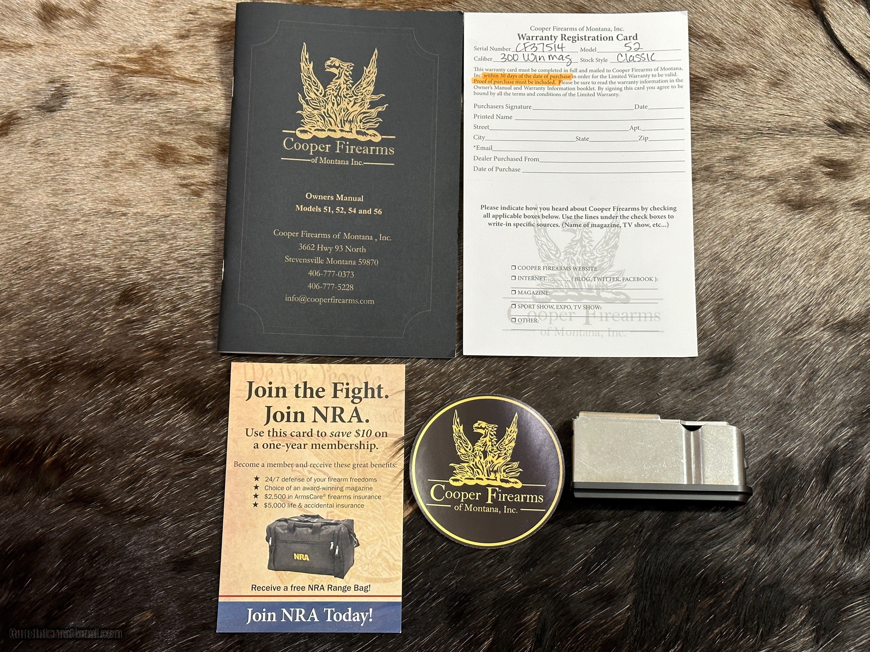 Description: LNIB COOPER FIREARMS MODEL 52 CLASSIC RIFLE IN 300 WINCHESTER MAGNUM WITH AAA TURKISH WALNUT AND OTHER UPGRADES - LAYAWAY AVAILABLE! THIS RIFLE IS LITERALLY LNIB - RATINGS: Wood: 100%; Finish: 100%; Metal: 100%; Finish: 100% - THIS RIFLE HAS BEEN SO WELL TAKEN CARE OF THAT IT LOOKS LIKE IT HAS NEVER BEEN OUT OF THE BOX. FREE AFRICAN SAFARI WITH KUCHE SAFARIS (: KUCHE.CO.ZA) INCLUDED WITH THIS RIFLE! SAFARI IS FOR 1-HUNTER / 5-DAYS / 3-ANIMALS (IMPALA, BLESBUCK, WARTHOG). SAFARI IS CUSTOMIZABLE WITH AS MANY ADDITIONAL DAYS AND ANIMALS AS YOU WANT. THE CERTIFICATE IS GOOD FOR 3-YEARS FROM DATE OF PURCHASE AND WILL BE EMAILED TO YOU. NOTE: THE SAFARI IS FREE AND DOES NOT ADD ANY COST TO THE RIFLE. Features Of This Great Pre-owned AMERICAN MADE Bolt Action Rifle Include: