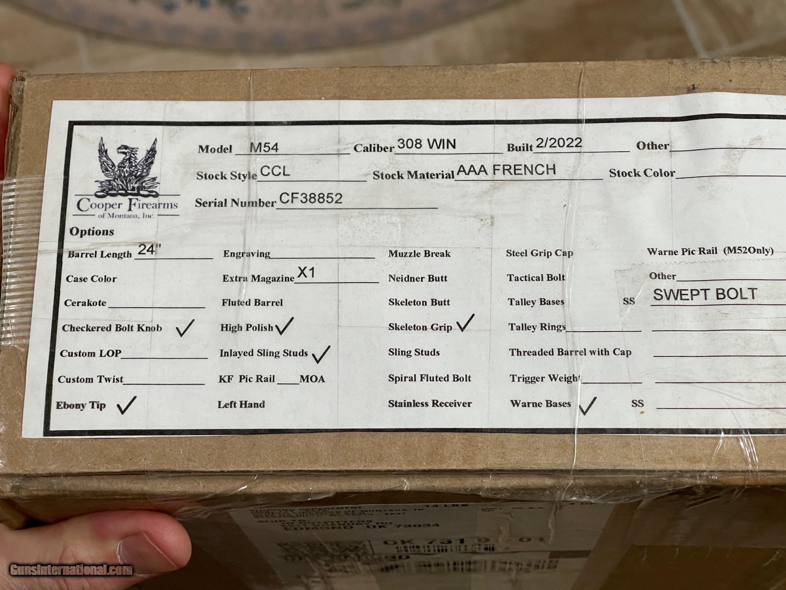 SOLD Rifle Caliber: .308 Winchester Manufacturer: Cooper Firearms of Montana Model: M54 Custom Classic w/ upgrades Serial Number: CF38852 Barrel Length: 24 Condition: New Stock: AAA French Walnut |