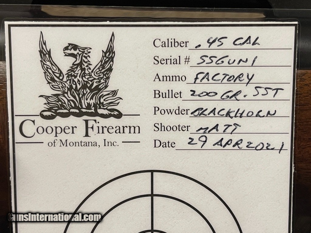 Description: NEW COOPER FIREARMS OF MONTANA MODEL 22ML JACKSON GAME .45 CAL MUZZLELOADER - LAYAWAY AVAILABLE. BUY A SCOPE AND RINGS FROM JD OUTFITTERS AND RECEIVE FREE MOUNTING. FEATURES OF THIS GREAT IN-LINE MUZZLELOADER INCLUDE: