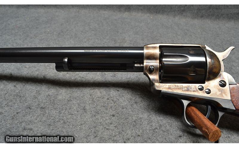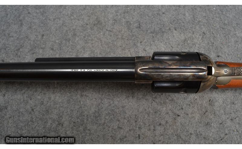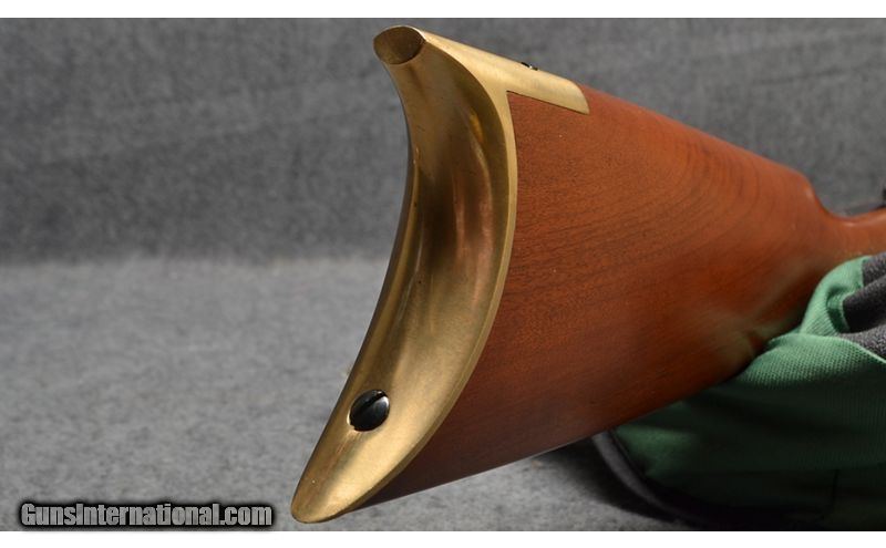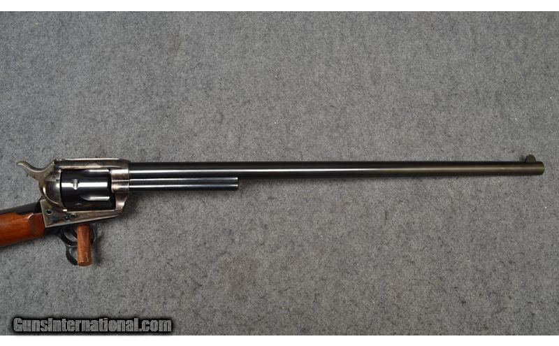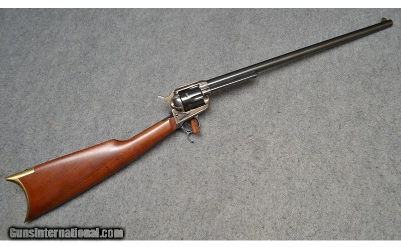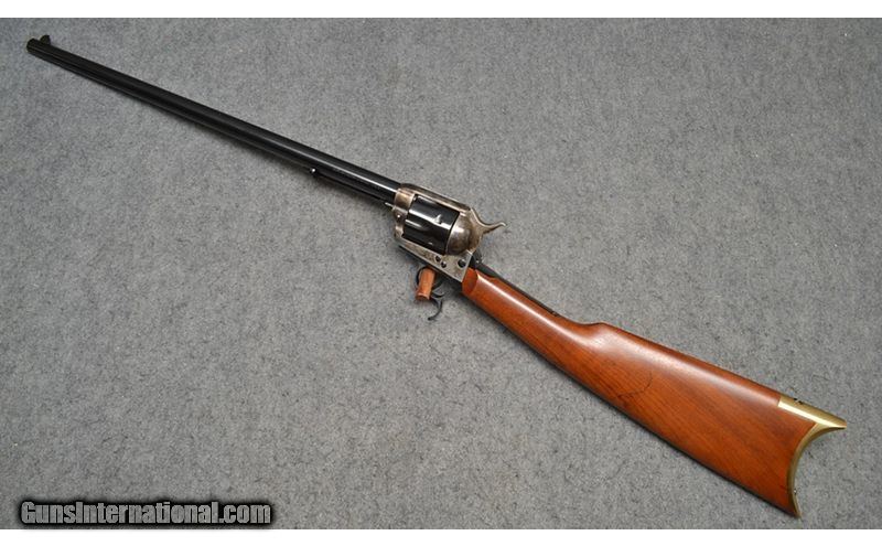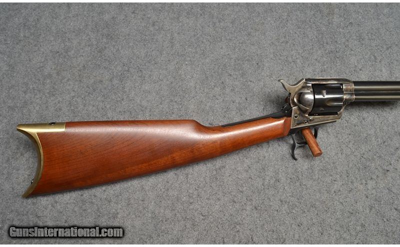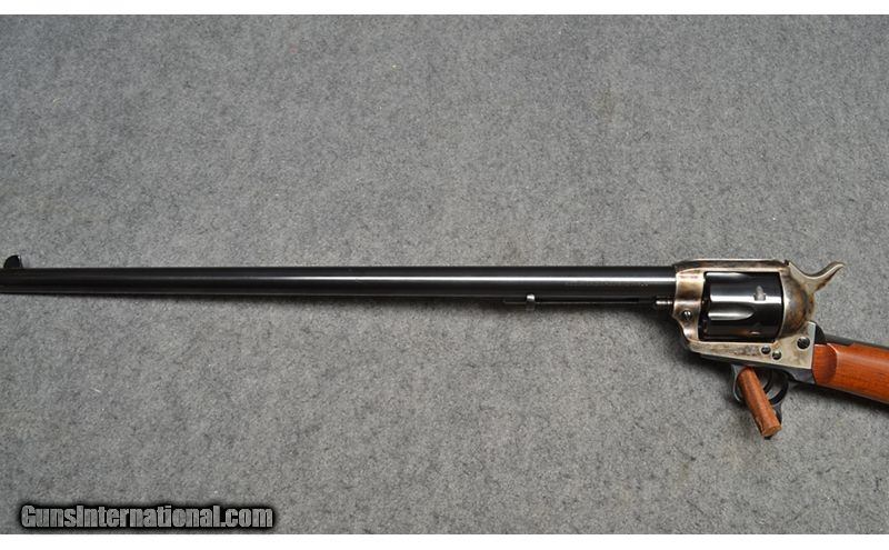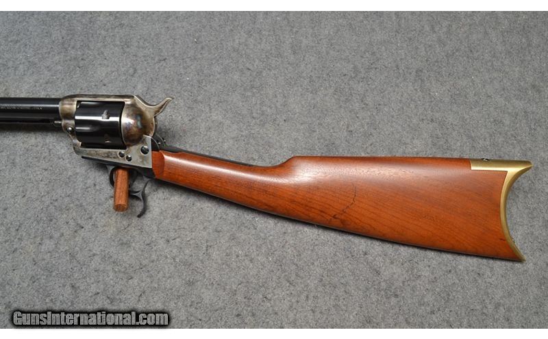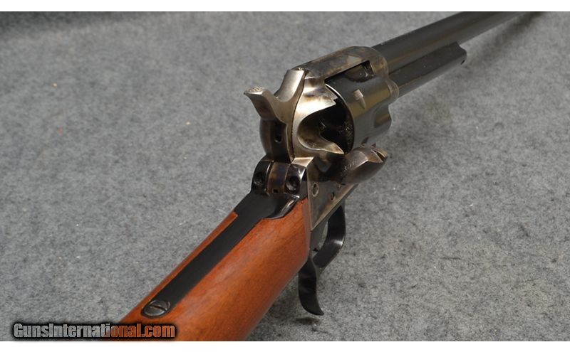 Description: This revolver carbine replica is an EMF single action American Carbine chambered in .45 Long Colt. It has a front blade sight, colored hardened receiver and a solid brass butt plate. It is in excellent condition with only a minor handling mark at the bottom of the stock. .45 Long Colt SOLD Metal Condition: All metal is in excellent condition Wood Condition: Wood stock shows very minimal handling wear Bore Condition: Bright and shiny Barrels: 18 inch barrel Stock Dimensions: Overall length 34½ inches Fore End: Bluing in very good condition Butt Pad: Original brass butt plate Weight: 3 lb 15 oz Sights: Front blade sight Item Location: Wichita, KS |
