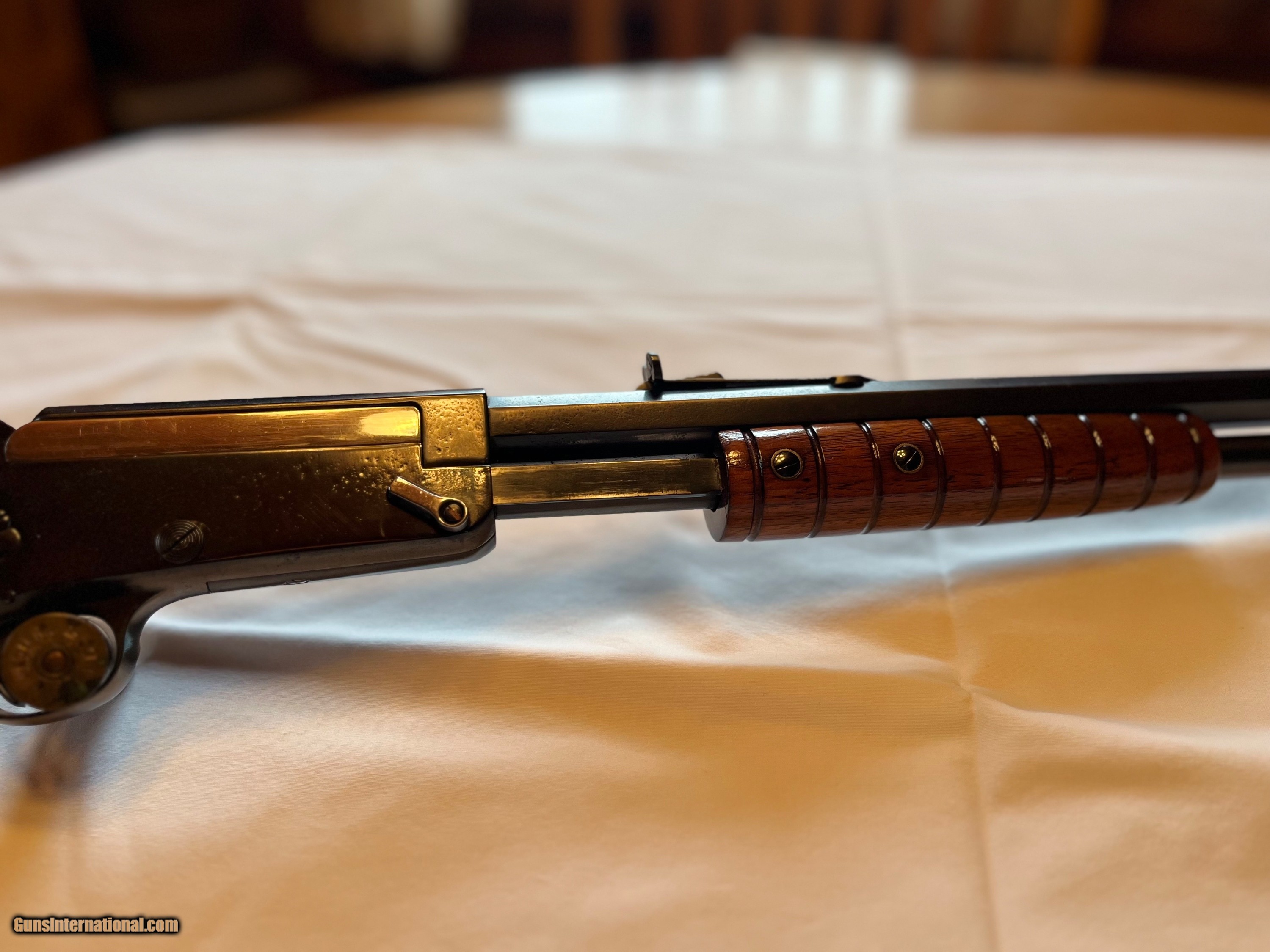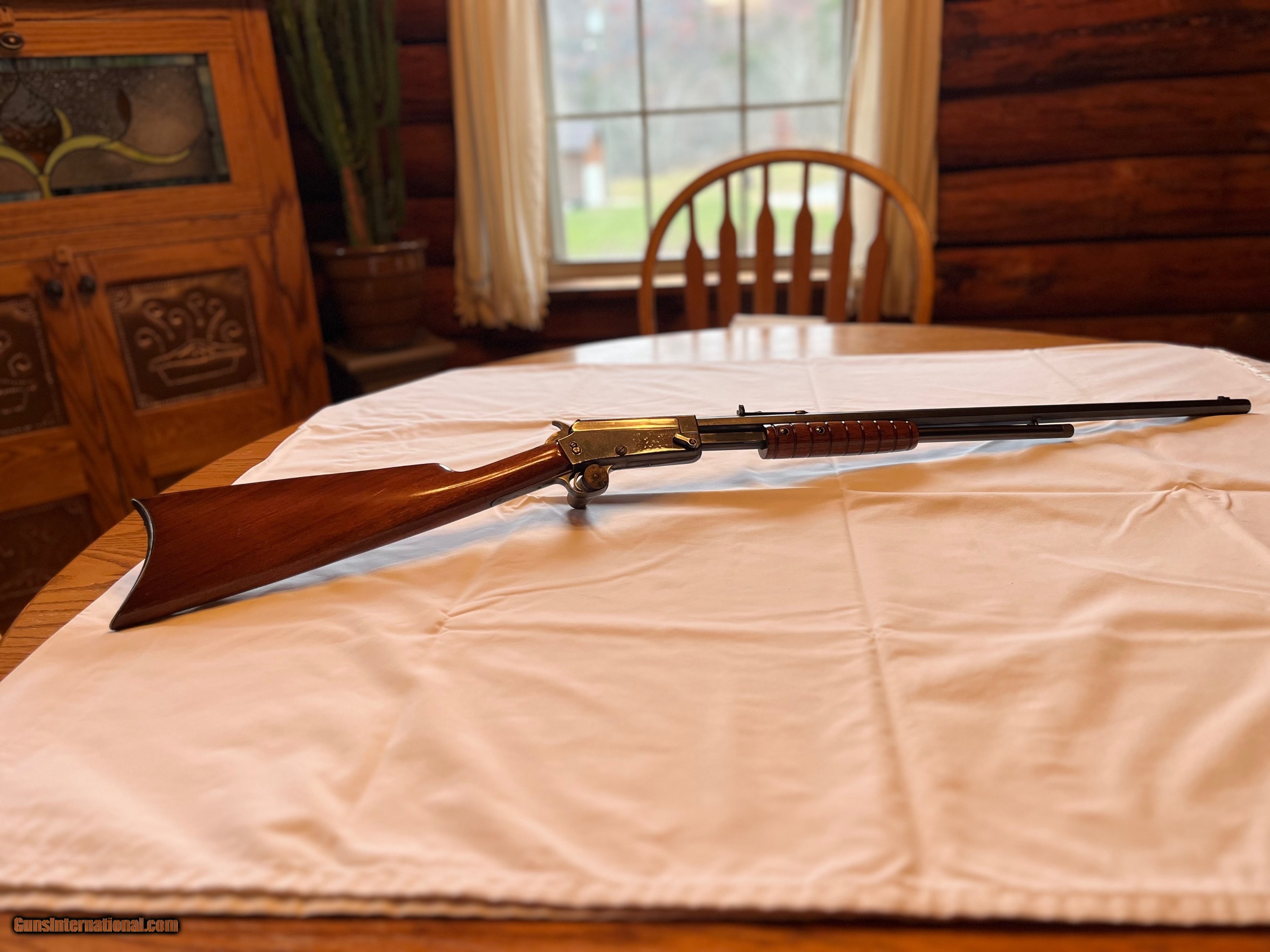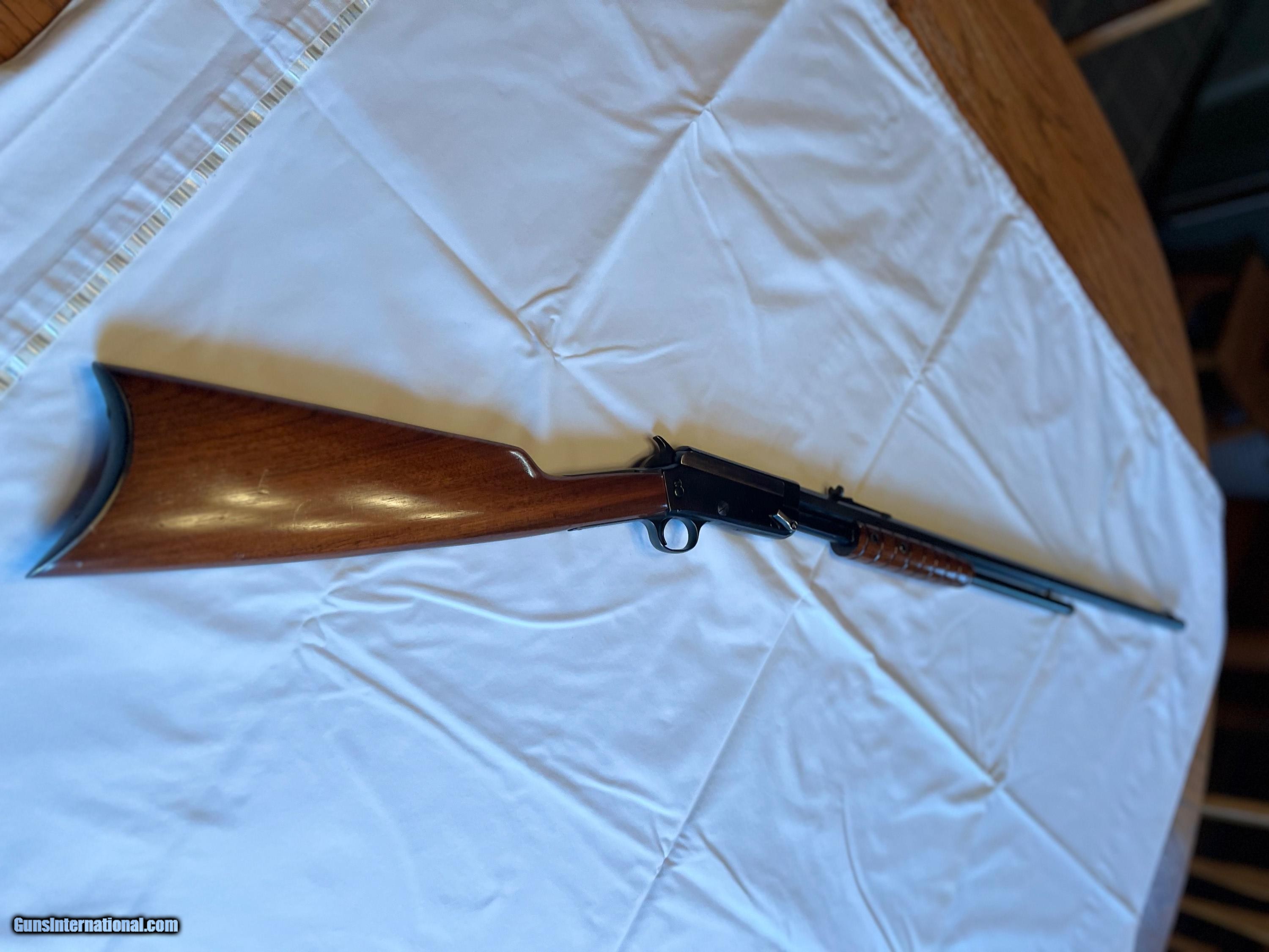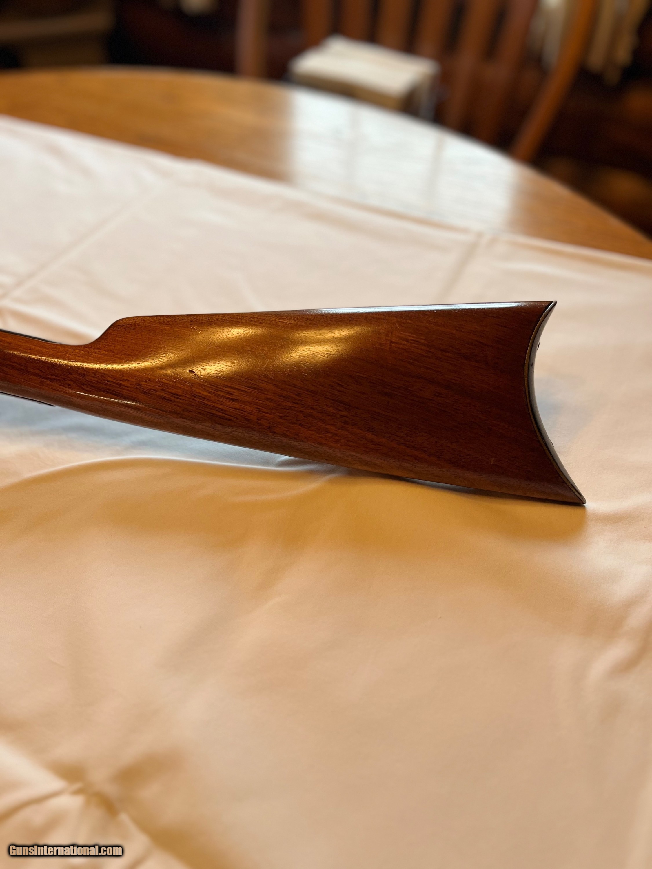 Description: Marlin model 27S slide action takedown .32-20 with 24" octagonal barrel, walnut stock and forearm, 9 shot tubular magazine and Swiss style steel buttplate. Serial no. 12083 . Everything operates smoothly and as it should. Bore is good. Great first deer rifle, plinker or collector gun. Great shape to be over 100 years old. Must be shipped to an FFL. Please add $60 for shipping. Curio/Relic: Yes Rifle Caliber: .32-20 Winchester Manufacturer: Marlin Model: 27S Serial Number: 12083 Barrel Length: 24” Condition: Very Good Metal Condition: Good Wood Condition: Good Bore Condition: Good Action: Pump Stock: Walnut Fore End: Walnut Butt Pad: Swiss Style steel Manufacture Date: 1915 Optic: Open Sights Price: $1,000.00 Shipping: $60.00 Buy Now Contact Seller |