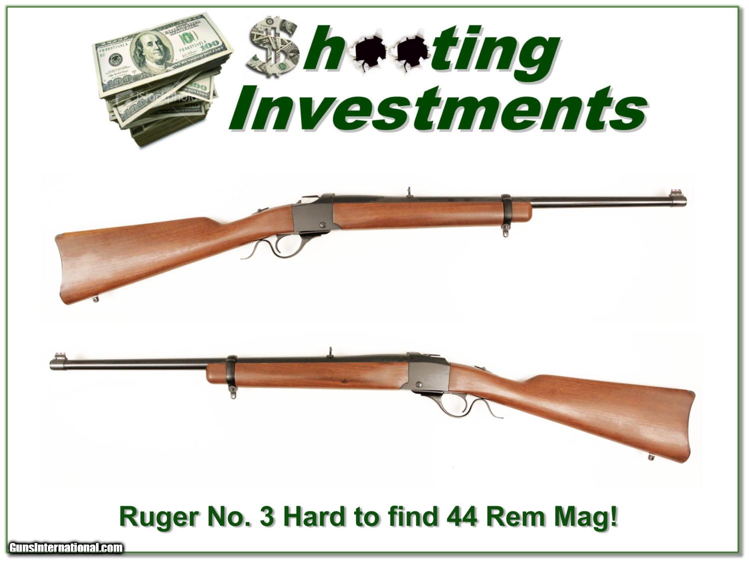 Description: Collectors, shooters and hunters, this is an as new Ruger No. 3 in the hardest to find 44 Remington Magnum with an estimated production of only 500. It will be hard to find a nicer one! Shipping and insurance is $35 or $15 more if you want it shipped in a new Plano hard case. Please email me with any questions or larger pictures. (I now consign quality firearms only 10%! Let me know if you have any you would like to sell!) [16-0054] Payment: Payment is by Money Order, Cashiers Check or Personal Check. I can now also accept MasterCard and Visa with a 3% convenience fee. PayPal can be used for some items but never firearms. Please let us know if you would like to pay via PayPal. Shipping: The shipping charge will be listed in each description. It is $35 for most guns. Some heavy guns or those insured for over $2000 will be higher. Shipments to Alaska and Hawaii are higher because air shipment is required. Most firearms are shipped within 5 days of receipt of payment. We prefer shipping at the beginning of the week to avoid firearms in transit over weekends. We package all shipments carefully and insure them for the full purchase price, rounded up to the next $100. In the unlikely event that damage occurs, it is important that you save all packaging material for the claims process. Optics are shipped Priority Mail and most other non-firearm shipments are shipped First Class. Returns: Our return policy is simple. If for any reason you are not pleased with your purchase, you may return your item for a refund. The only exception is ammunition, it cannot be returned. It is important to us that you are happy. Guns cannot be fired or dissembled before returning them and must be returned in the same condition as received. Notification of a return must occur with-in 3 days of receipt at your dealer. Shipping, convenience and dealer fees are not refundable and are the responsibility of the buyer. Lay-a-way: If needed, we offer a 60 day lay-a-way option on most firearms. It is 1/3 now, 1/3 in 30 days and 1/3 in 60 days. Lay-a-way firearm sales are final. Consigning your firearms with Shooting Investments: We will help you get top dollar for your firearms. While most local guns shops charge 20% or more, our fee is only 10% with a minimum of $50. At your local gun shop it might take months to sell. Selling on-line provides instant access to thousands of interested buyers. You won’t find any other on-line dealer willing to sell your firearms for only 10% or listing every gun on 4 separate s. Selling through an House typically costs the seller 15% and the buyer an addition 15% (so 30%) and you have to wait several months to sell and longer to receive funds. If properly priced, we will sell your firearms in a week or two. Send us an email or give us a call and we’ll explain how easy it is for you to get top dollar. Trading: We collect guns and usually just trade for guns we want to add to our collections. We often sell guns for others wanting to purchase one of ours. We find this the most fair to both of us. Our Commission is only 10% and we hold the gun you want until yours sells. Please contact us if you want to sell one of yours to buy one of ours. Help for California Buyers: We are happy to ship to California. It is the buyer’s responsibility to make sure any item you buy is legal in your state. We are also happy to help with your purchase of a firearm from someone other than us. If you see a gun you would like to buy but the seller can’t or won’t ship to California we can help. You buy the gun and have it shipped to us. We’ll then ship it to your California dealer. The cost for this service is only $30 + shipping. Let me know if we can help! SOLD |