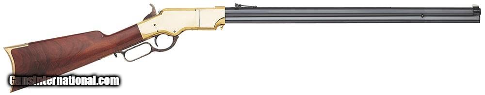 Description: Guns Listing ID: 154188 Taylors and Companys 1860 Henry Lever Action features a 2414 Octagonal Tapered Blue Barrel with brass frame and butt plate. The \"Henry\" named after its inventor is the first repeating rifle in history. With it one man could load 15 cartridges in eight to ten seconds. It was such an important innovation that it was the equivalent as 15 men armed with tradtional firearms. This model features a 24.25\" tapered octagon blued barrel forged brass frame and brass butt plate. The barrel has an integrated magazine tube with a 13round capacity a rear ladder sight and a blade front sight. It has a beautiful walnut stock for a total length of 43.75\".\ Manufacturer: TAYLOR‚S & CO. Model: 1860 Caliber Info: .45 LC Condition: new Barrels: 24.3" BARREL Action: LEVER ACTION Finish: BROWN Weight: 9 LBS. Price: $2,099.99 Contact Seller |