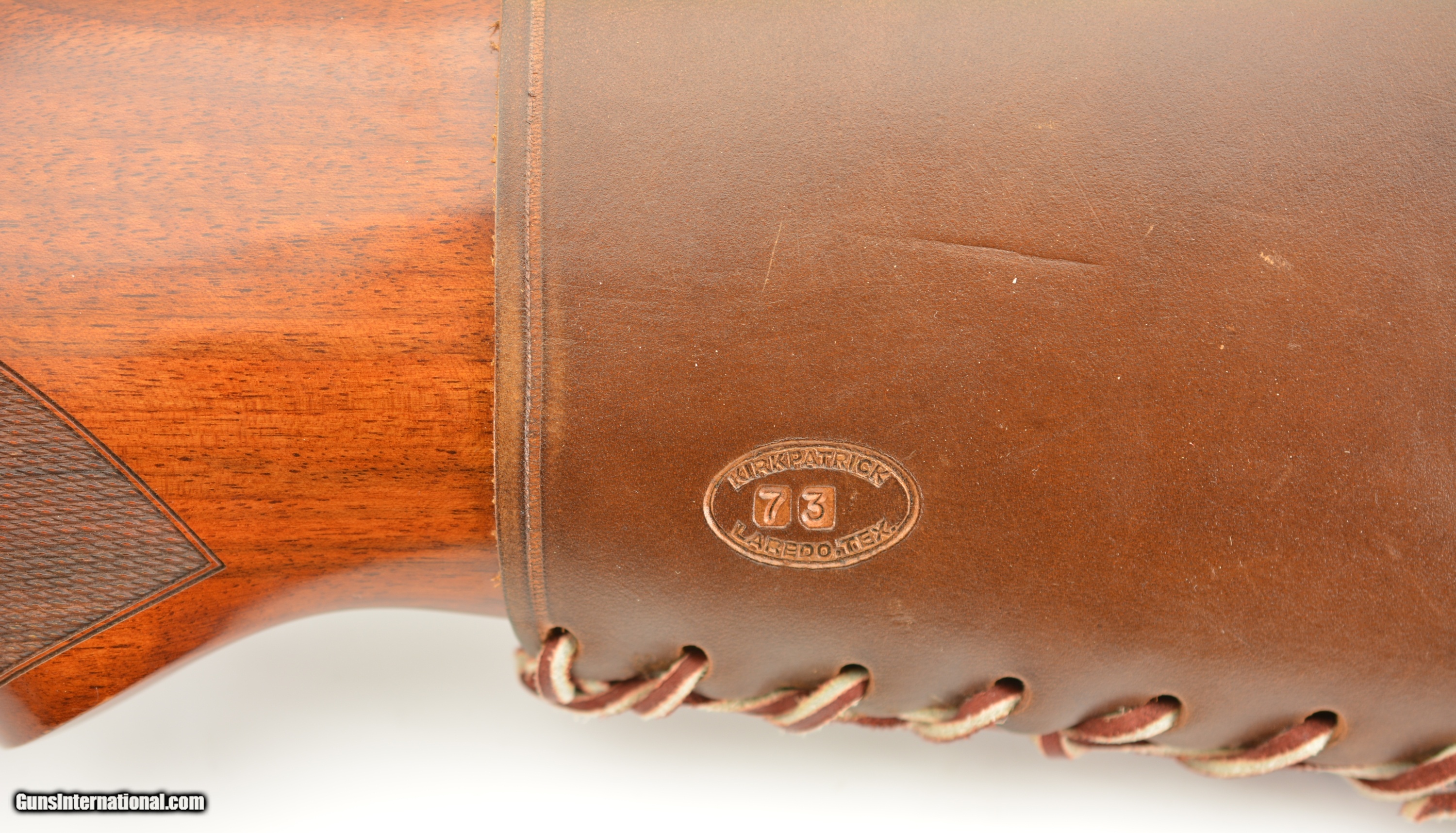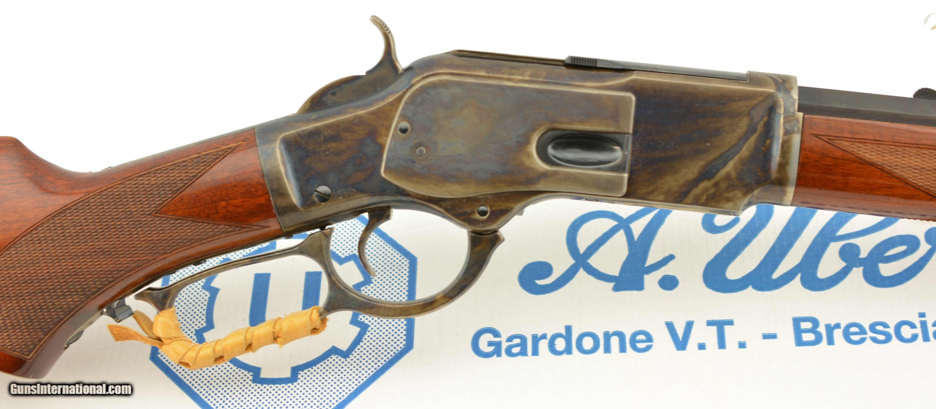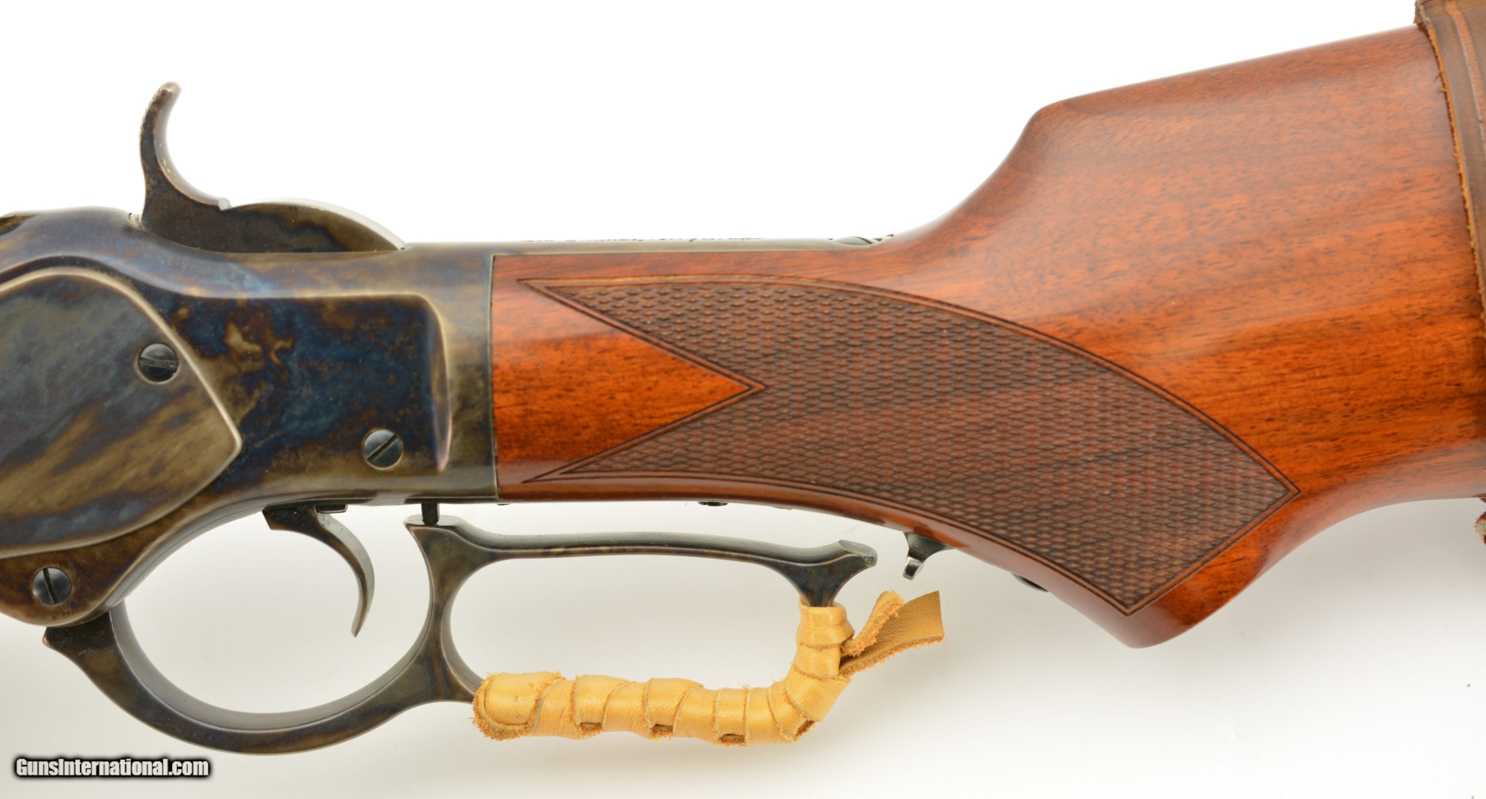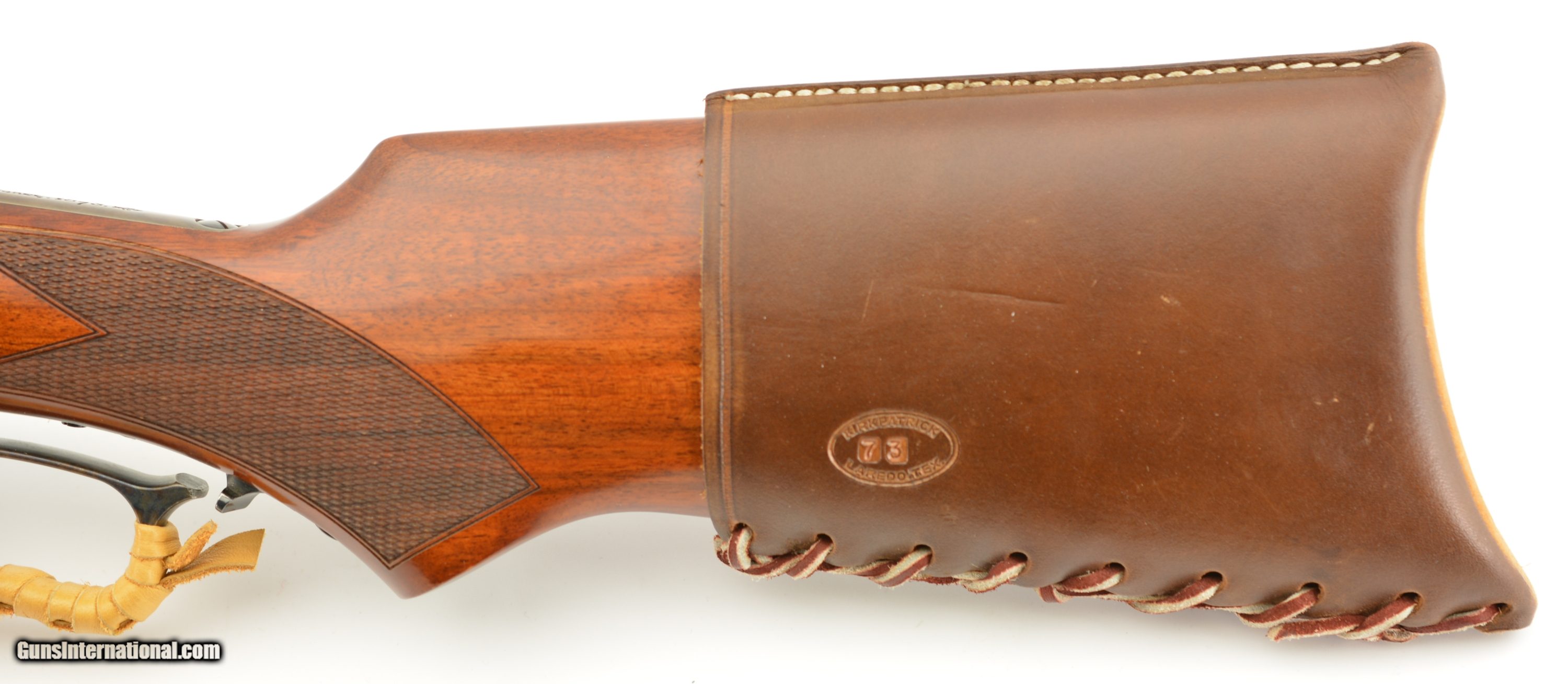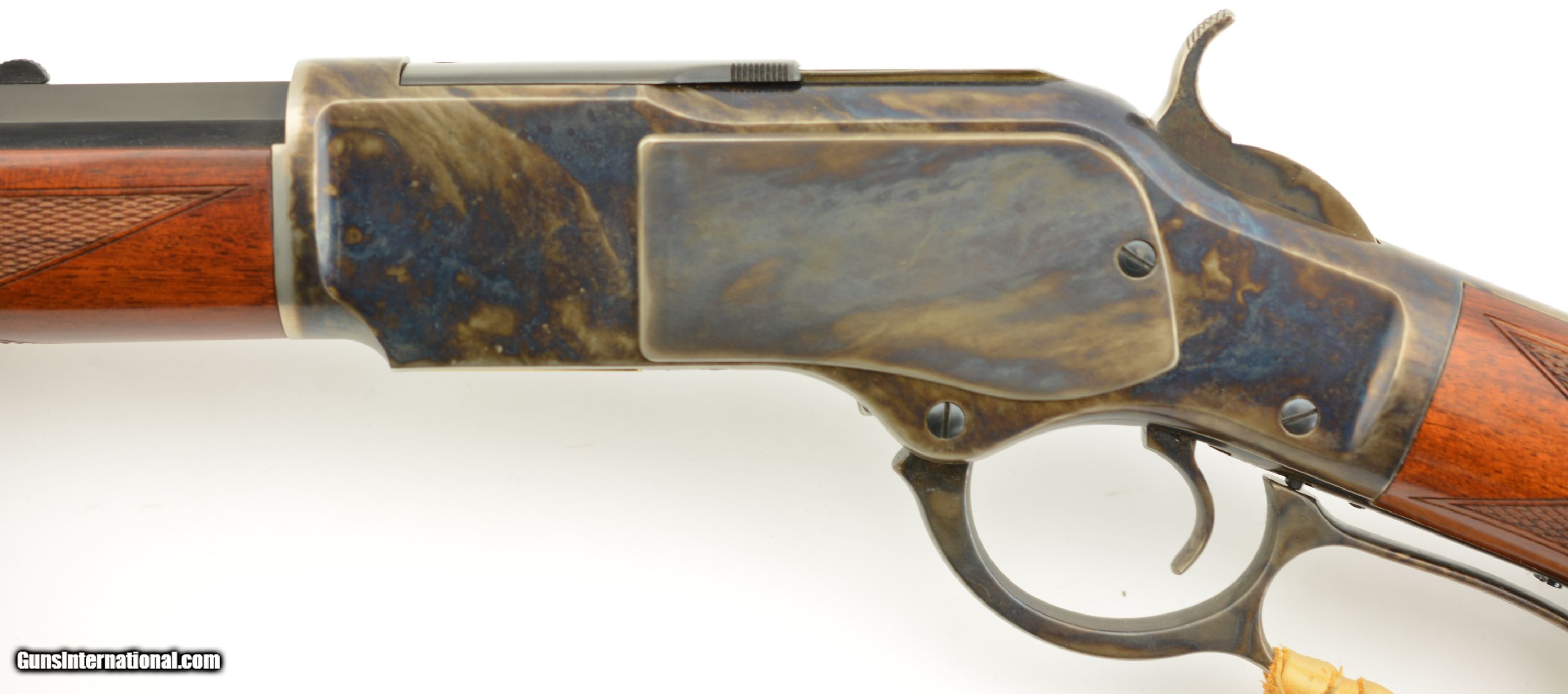 Description: Serial #W21195, .45 Long Colt, 18" barrel with a bright, excellent bore. This is the Winchester Model 1873 trapper manufactured in Italy and imported by Taylors & Co., Winchester, VA.. The carbine length rifle is in excellent plus condition retaining virtually all, 99% plus original blue finish on the barrel and mag tube with equal amounts of vibrant case color on the receiver, hammer and lever showing only very minor blemishes from handling and storage. The checkered walnut stock and forearm are likewise excellent with some very minor storage nicks and handling marks. It has been embellished with a leather wrap on the lever and a leather Kirkpatrick butt protector made in Laredo, Texas and marked “73". It comes in the original cardboard box numbered to the gun. A great Cowboy action rifle or useful in areas where you can hunt with pistol caliber carbines. FFL SOLD Manufacturer: Uberti Model: 1873 Serial Number: W21195 Caliber Info: .45 LC Gauge Info: .45 LC |