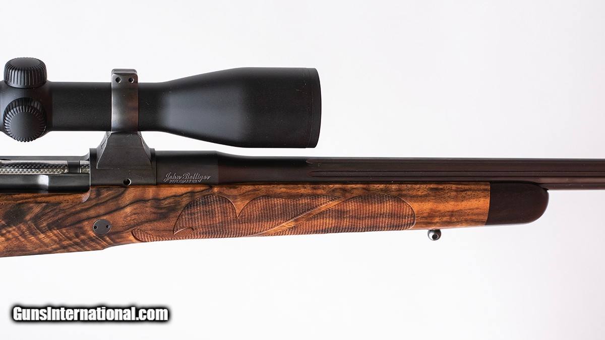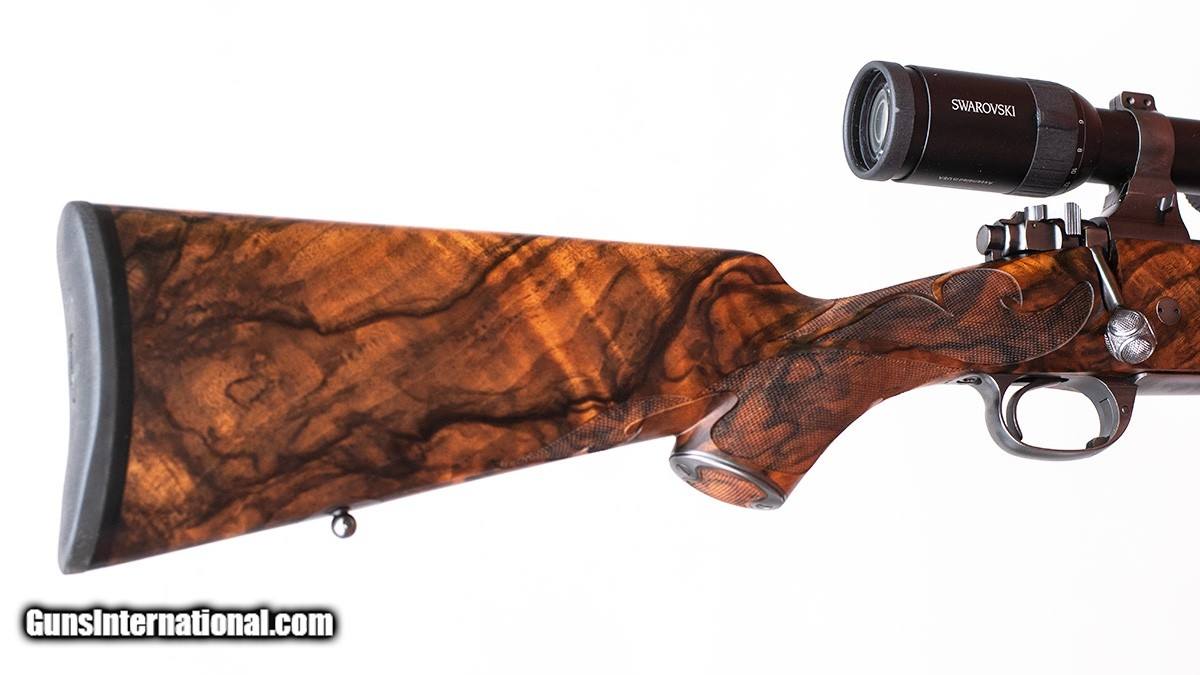 Description: Highly figured Turkish walnut, Mr. Bolliger's signature Fleur-de-lis checkering pattern, Bolliger's custom scope mounts, 5 panelled checkered bolt knob, custom one-piece bottom metal, fluted barrel. Slight mark in stock on toe line behind sling swivel (see pic). Otherwise in like new condition. See photos for rifle specs. SOLD Rifle Caliber: .338 Winchester Magnum |