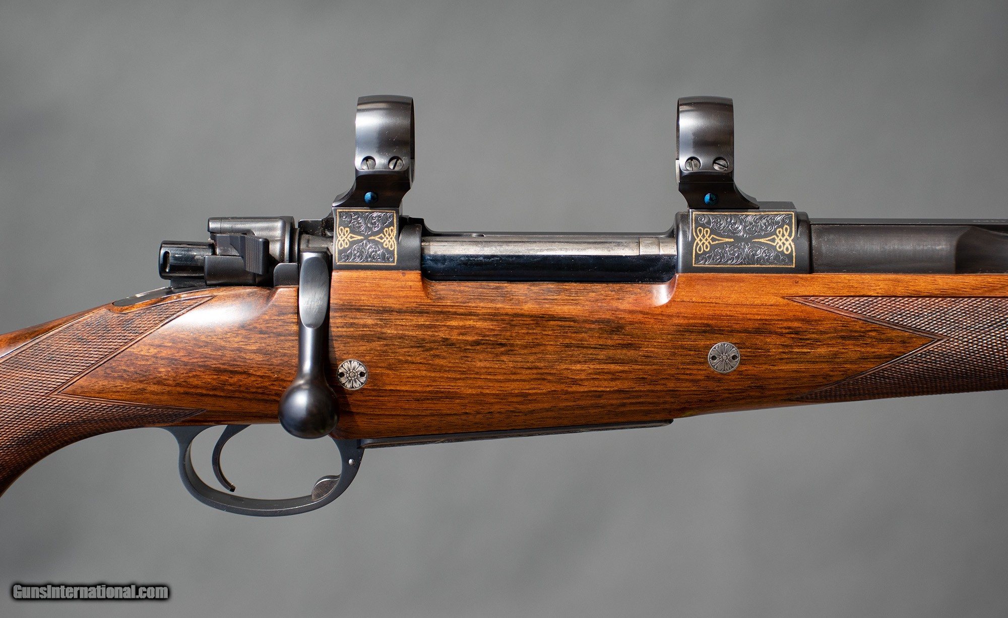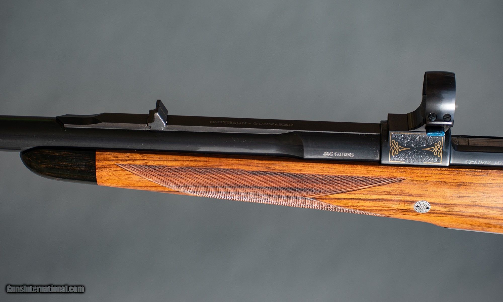 Description: Extremely well balanced big bore by one of the finest gumakers of our day. The English walnut is dense with perfect layout. The engraving by Mark Swanson is spectacular. Topped with Joe Smithson's quick detach 30mm rings.