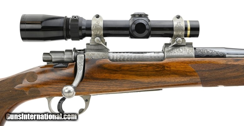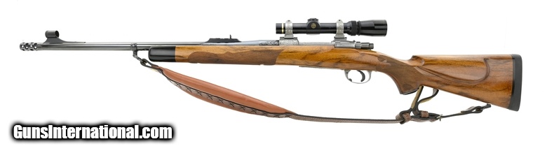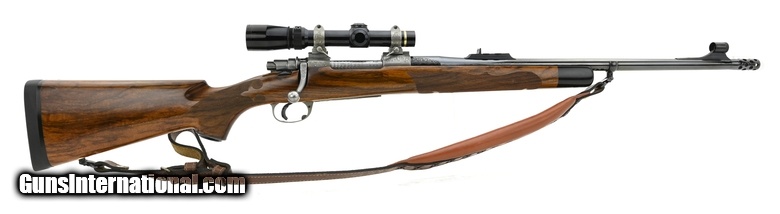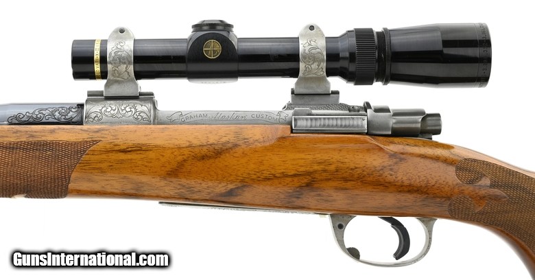 Description: " Graham Custom Alaskan 375 H&H Mag caliber rifle. Beautiful custom dangerous game rifle built on a commercial Mauser action. The barrel is marked “Graham Custom" and the receiver is marked Graham Alaskan Custom. The receiver, floor plate, trigger guard and scope mounts have a French grey finish and are scroll engraved. The floor plate is engraved with a game scene of a grizzly. The stock is of figured walnut with fine fleur-de-lis checkering and ebony forend tip. The barrel has a muzzle brake and open sights with a 3-leaf rear sight. The forward sling mount is on a barrel band. Has a Leupold 1.5-5X scope. A top quality piece, in excellent condition SOLD |