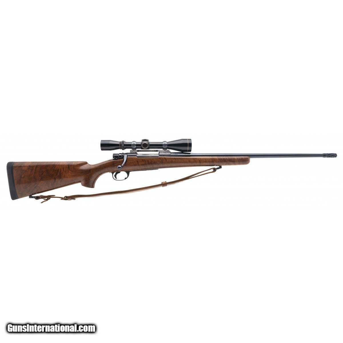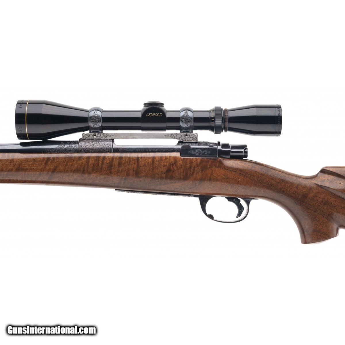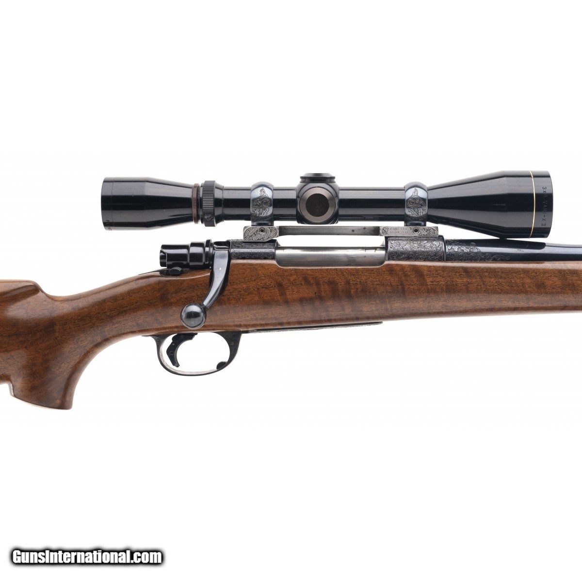 SN:B78366. made in 1975 date code ""0475"". 7mm rem mag with a 26"" barrel. Bore is excellent. Metal has 99% of factory blue, engraved by Sam Welch on receiver, mounts, floor plate and has gold inlaid elephant with silver tusk. Deluxe Monte Carlo walnut stock. Mounted with Leupold 3X9 Var-X II. Has custom muzzle break. Overall condition is excellent.