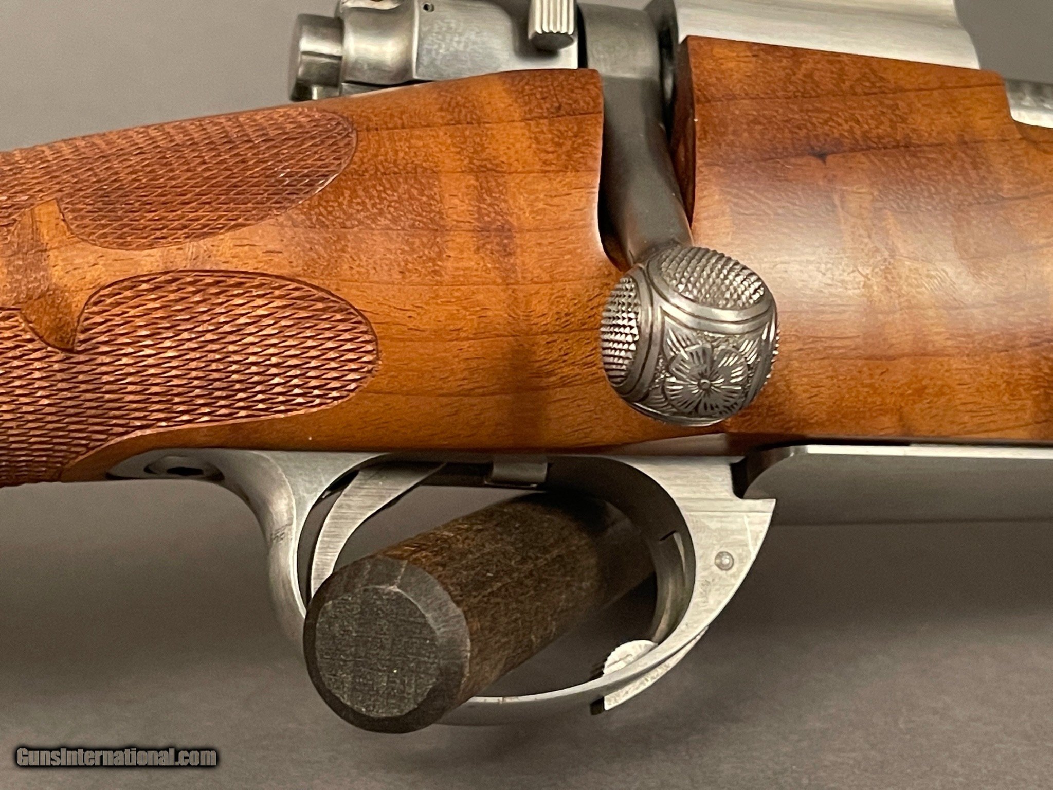 Description: From a private collection. We have a Custom bolt action rifle purchased from John Bollinger Sr. Bolt engraving was done by the legendary Jerome Glimm. Rifle had a small crack on the left side of stock next to where the chamber tapered. The crack was looked at and repair by John Bollinger Jr and certified to be in great working order for the remainder of the rifles life. Stock does have a few dings / handling marks. Jr questioned the barrel having no signature and the style of checkering on the stock. We discussed that this could've been one of the rifles built during his classes that he gave. He did say the bolt was engraved by Jerome, the 1st gen tally bases are correct and the shape of the barrel / contour was correct also. He could not verify the serial number due to a harddrive crash and he having to turn over his earlier books during the time of the failed hardrive. The owner of this gun said he bought this rifle from Sr in the early to mid 90's. He's owned several Bollinger's and I have no reason to not believe his story. barrel length - 22" LOP - 14 1/4" Ted Blackburn straddle floor plate assembly This rifle is priced to move. Don't miss this beautiful custom rifle. SOLD Rifle Caliber: .30-06 Springfield |