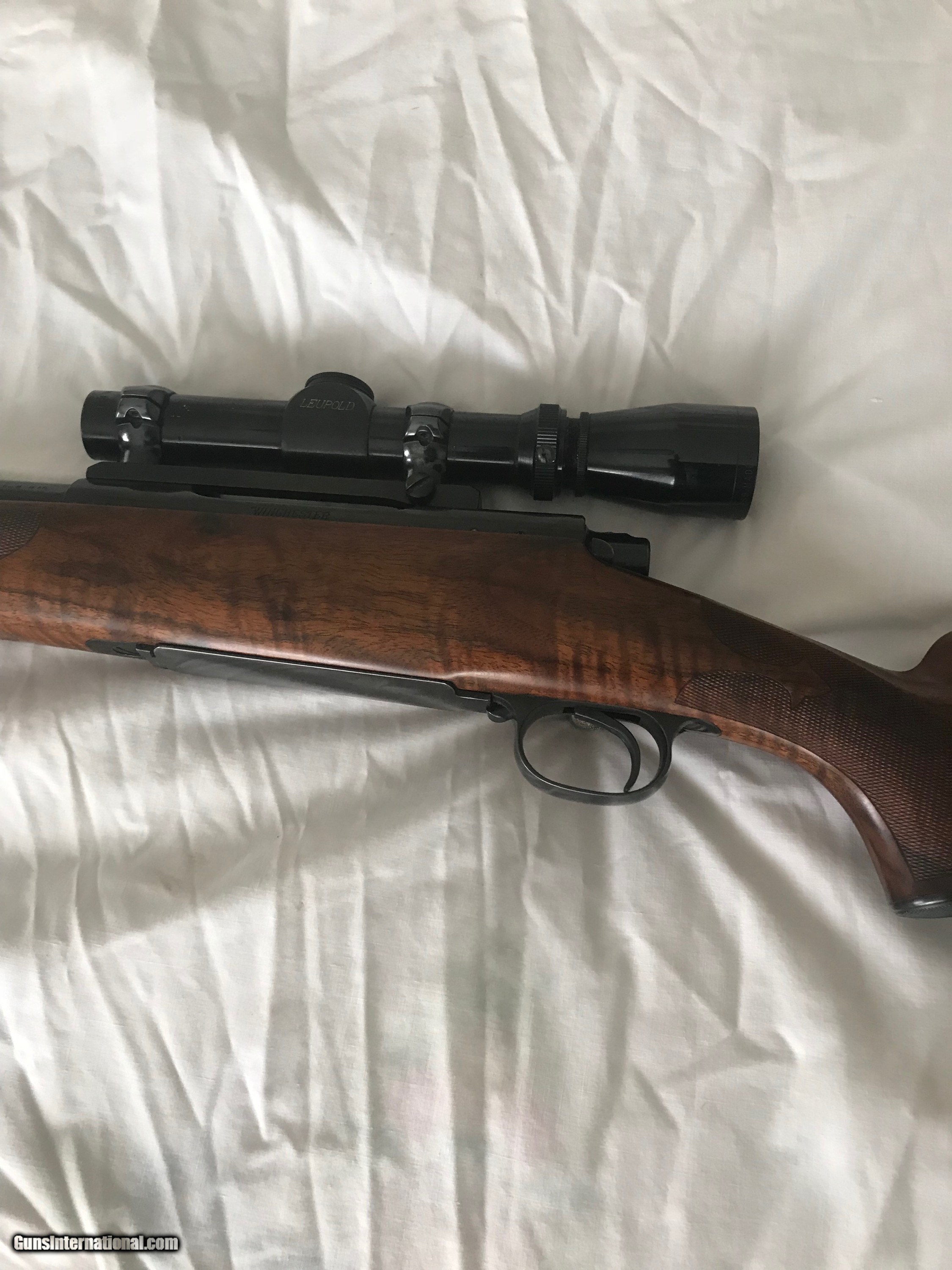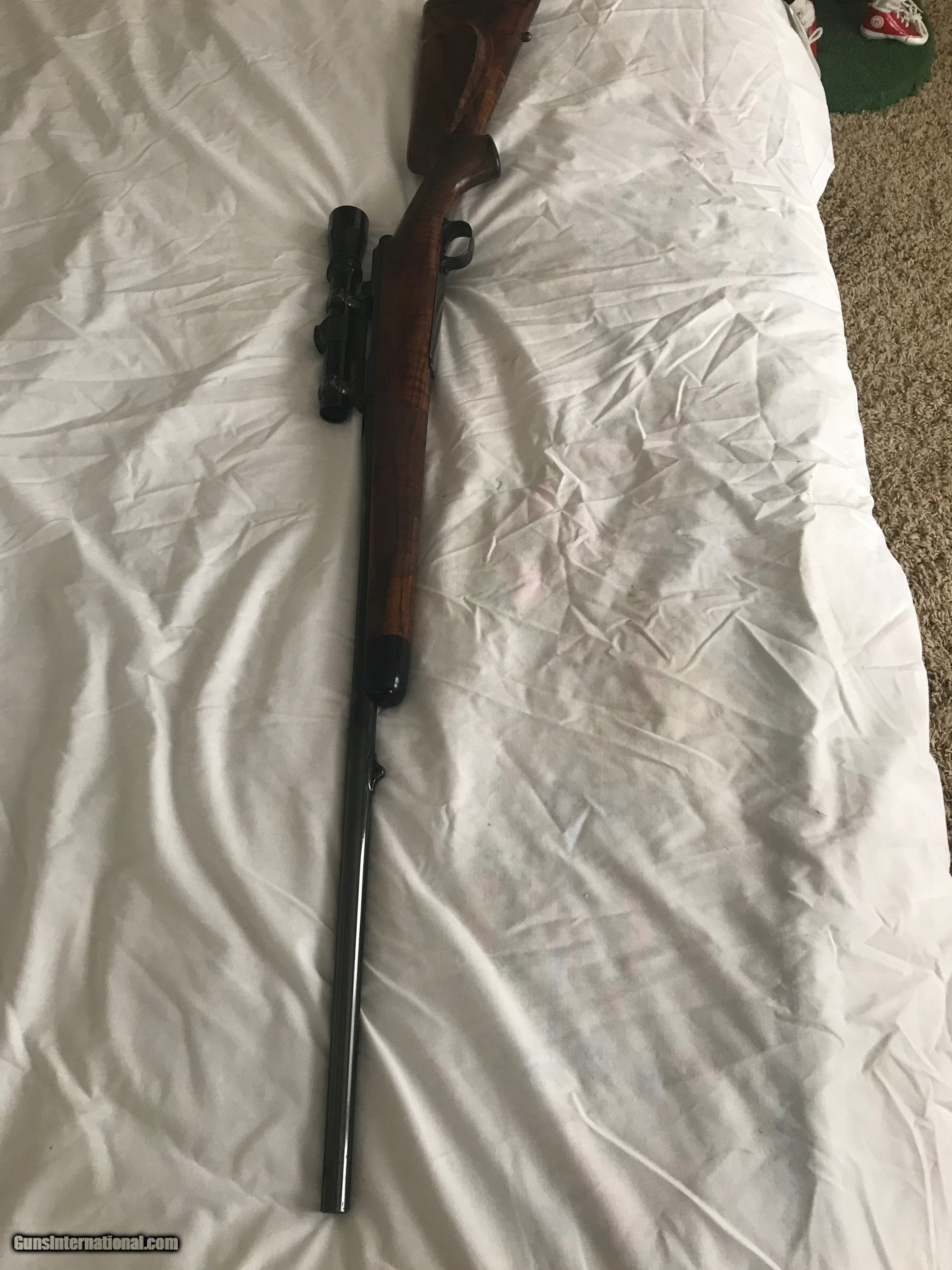 Description: Custom 375 H & H built in 1982, Pre 64 M70 action made in '53, 24" Douglas premium barrel, jeweled bolt and follower, bottom of bolt knob checkered, front sling stud brazed to barrel. English walnut stock, ebony forearm tip, Fleur-D-Alis checkering. Checked metal grip cap. Pachmayr presentation recoil pad, Leupold 1x4 scope, Redfield 1 piece mount, soots Speer 285 gr G.S. into 1". All metal and stock work by Bob Johnson Spokane Wa. 99% overall SOLD |