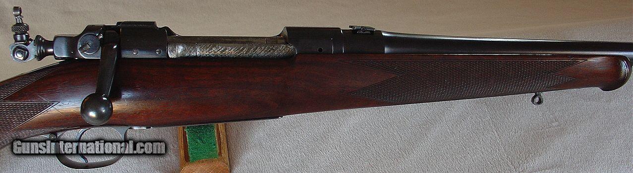 Description: A.O. Niedner Custom Springfield Stocked by the Highly Regarded Tom Shellhamer. This is one of the neatest Sporter's to come my way. It was no doubt built for by someone who was not commissioning his first rifle. He obviously knew what he wanted; which is evident from the special features incorporated into this rifle. Such as, the cocking shroud and bolt lock by E.R. Stahl. All work is first rate, as would be expected. The Stahl cocking piece has taken virtually all movement out of the bolt peep; which has always been the bane of bolt peeps. Barrel appears to a Niedner custom built barrel, with a perfect bore. Stock which does not carry the usual Shellhamer chinstrap is signed by him under the buttplate. The only number on the rifle is 797 under the barrel; placing it about midway in the production range of Niedner rifles. The guard bow safety actuates from the left side, with the stock cast off to the right for a right hand shooter!. Just another feature that adds to the mystique of this already unique rifle. A Truly Rifleman's Rifle! MakerNiedner Rifle Corp., Dowagiac, MI USA Gauge/Caliber30/06 BarrelsCustom 24" Chokesn/a Engravingn/a ActionSprinffield StockCircassian ButtCheckered Niedner Style L.O.P.13 5/8" Weight7 lbs. 15.1 oz. Stock Dimensionsn/a SOLD Curio/Relic: Yes |