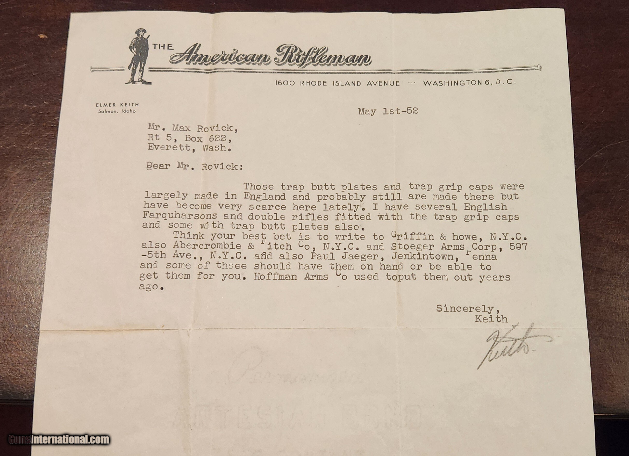 Description: Al Biesen Custom Mauser 98 commissioned in 1952. Kept in original, as-new condition exactly the way it left Al's bench. The rifle has over 25 pages of correspondence between the original owner and Al, the engraver, various parts suppliers and even a hand signed letter from Elmer Keith assisting the original owner search for butt plates and grip caps. The scope is the original Lyman Alaskan, also in as-new condition. The invoice for the scope is included in the paperwork. The rifle has a Griffin and Howe side mount as well as a receiver sight. The slide to the sight is still in the trap butt in the small flannel bag Biesen made for it. No expense was spared at the time of production, including a gold inlay of a grizzly bear on the floorplate. The bore is perfect, and there are little to no signs of handling anywhere. I have personally owned over a dozen Biesen rifles over the years, and have inspected dozens more, and have never seen one from the golden years of Al's career that is still in this condition, or with this level of documentation. Truly a once in a lifetime opportunity for a collector of classic American hunting rifles from the golden age of big-game hunting. Curio/Relic: Yes Rifle Caliber: .30-06 Springfield Manufacturer: Al Biesen Model: 70 Barrel Length: 22 Condition: Like new Action: Bolt Price: $12,500.00 Shipping: $200.00 Contact Seller |