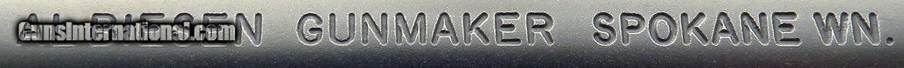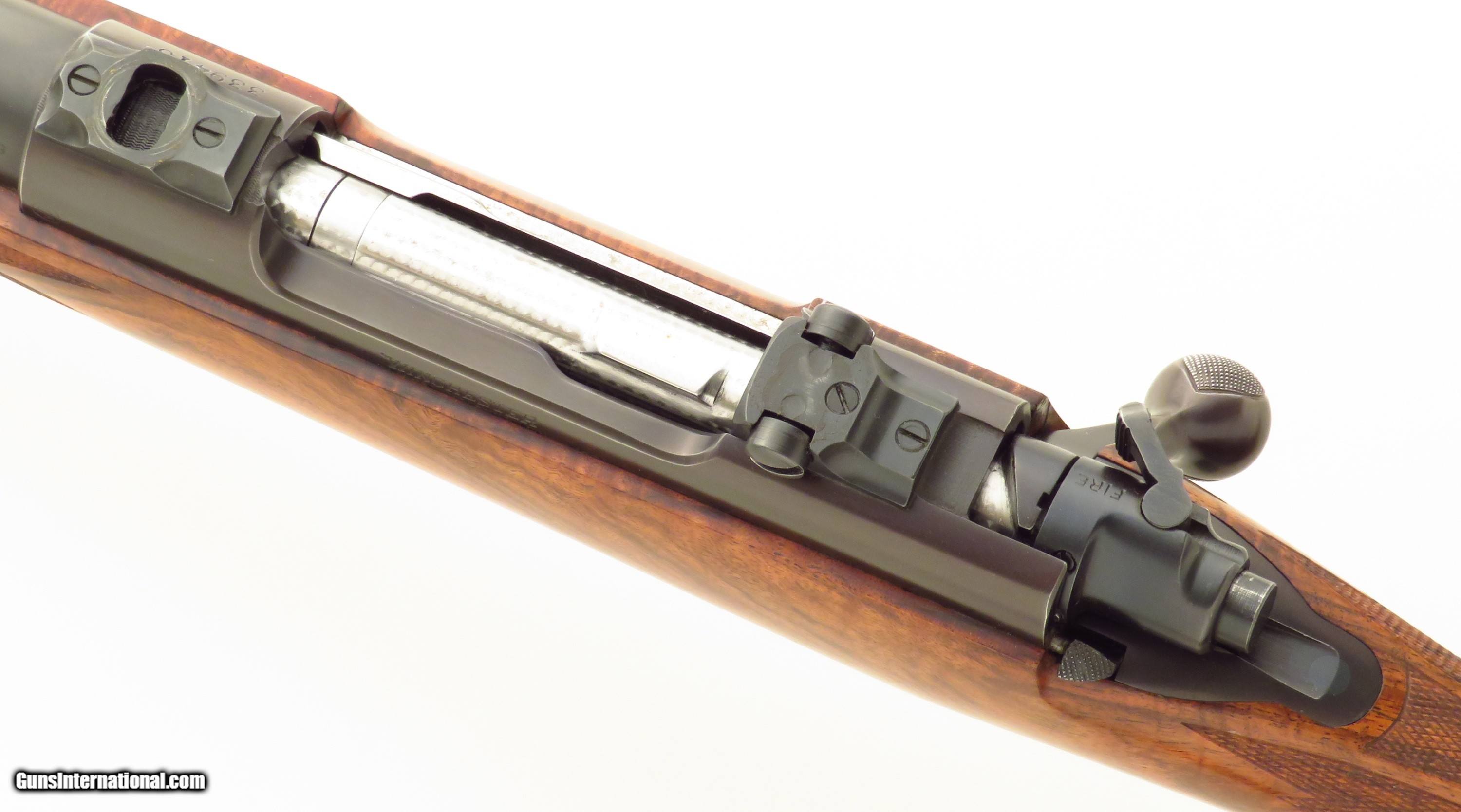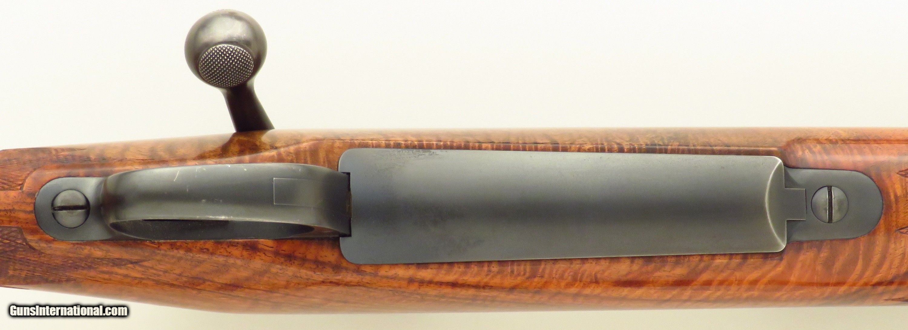 Description: Al Biesen custom Winchester pre-64 Model 70 .375 H&H Magnum. Based on a magnum-length action, serial 339413 has a 23-inch custom barrel (.685-inch muzzle diameter, recessed crown, banded sling swivel stud, second recoil lug at the forearm's midpoint). Features include a jeweled bolt body/extractor/follower, checkered bolt knob (two teardrop panels), reshaped and checkered bolt release button, tuned trigger and custom steel bottom metal. WOOD: Stocked from a bold-figured blank, appointments include an ebony forend tip with widow's peak, extraordinary 26 lines-per-inch wrapping borderless checkering (including a grip-top island and side flares), scalloped cheek rest with a shadow line, skeleton grip cap, inletted sling swivel stud and a Pachmayr Old English recoil pad. Metal finish is an elegant rust blue. ATTRIBUTIONS: Both barrel and stock are marked "Al Biesen". CAPACITY: Four rounds (three plus one, the fourth round being a single load with "snap over"). Feeding, extraction and ejection are smooth and positive). Leupold scalloped bases (for rotary/dovetail rings) are attached. DIMENSIONS: Weight is 8.0 pounds and the length-of-pull is 13.4 inches over the attached thin (.75-inch including base plate) pad. ACCURACY: Included three-shot test targets bear witness to repeated sub-MOA performance with 260-grain Nosler Partitions. CONDITION: The bore is bright and shiny with the merest suggestion of frost near the muzzle. Metal finish crowds 95 percent with minor evidence of handling and light thinning over the knob and plate. Wood exceeds 95 percent with a light scattering of impressions and minor finish rubbing at the shoulder of the rest. The price is firm and layaway is available. $6,750 plus shipping. SOLD Rifle Caliber: .375 H&H Magnum |