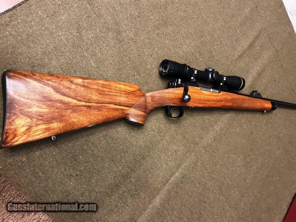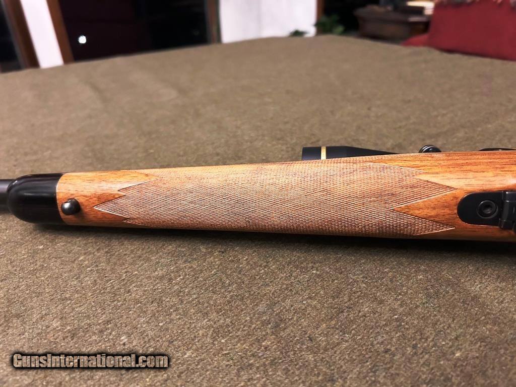 Description: · Pre-64 Winchester Model 70 that was in 30-06, then re-stocked and re-barreled to 338-06. · Stock is French Walnut with fine checkering · Rust Blued · Custom Dakota style scope bases with Leupold rings · Leupold 2.5-8X 36 mm scope with duplex reticle · Bieson hinged butt plate and a Bieson grip cap · Jeweled bolt and follower · Barrel banded front sight · Barrel channel has a gap that was filled with Acraglass · LOP is 13.5”