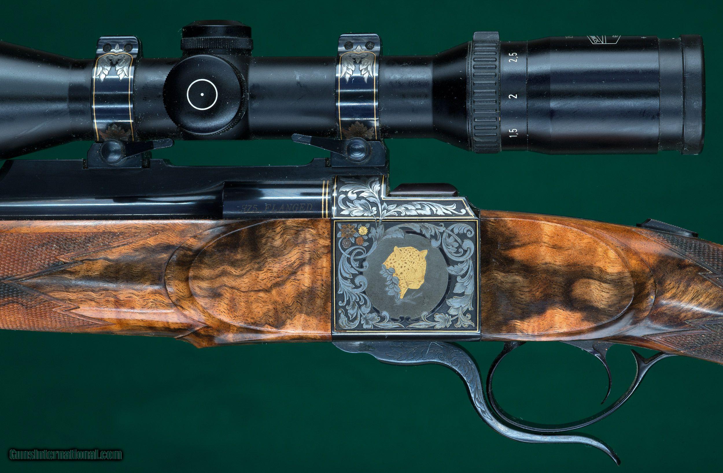Description: 26" tapered round Krieger barrel with detented-hooded full-band front sight, full-band swivel base and quarter rib. Highly figured dark walnut stock by Al Lind with schnabel forend, classic point-pattern checkering with mullered borders, beaded action sidepanels, compartmented steel pistol grip cap containing peep sight interchangeable with scope on quarter rib, beaded pancake cheekpiece, inletted and pedestalled rear swivel base, mercury recoil reducer, and leather-covered recoil pad. Metalwork by Ed LaPour using a Dakota Model 10 falling block action with top tang safety. Finely engraved by Bob Evans with gold borderlines, intertwining acanthus scroll, multi-colored floral inlays, a leopard head on left and a lion head on right. Loading lever, grip cap, quarter rib and scope rings engraved en suite. Schmidt & Bender 1.5-6x42 illuminated scope with No.9 duplex reticle on Talley quick-detachable mounts fitted directly to quarter-rib dovetails without separate bases. Pull: 13 3/8". Weight: 7lbs, 14oz with peep sight; 9lbs, 4 1/2oz with scope. Fine condition with excellent bore and 99%+blue. SOLD |