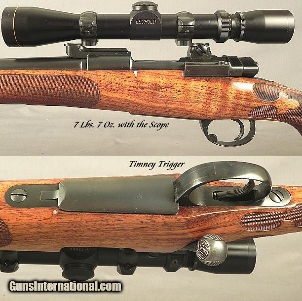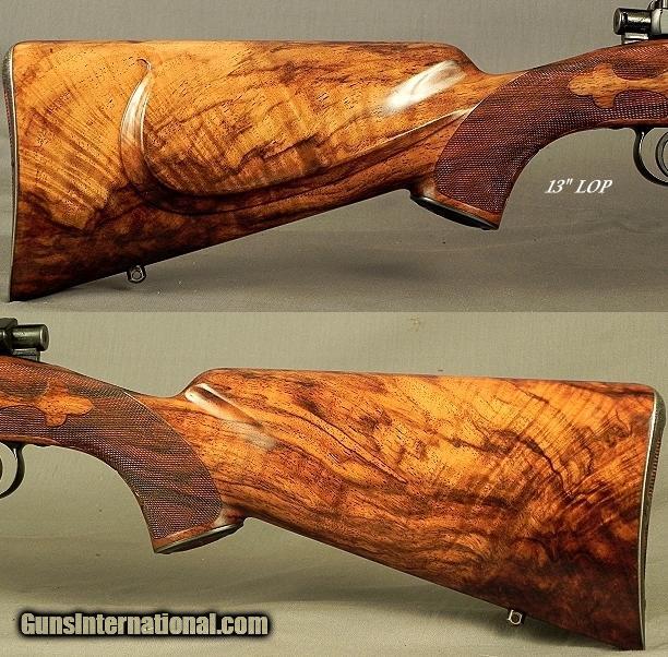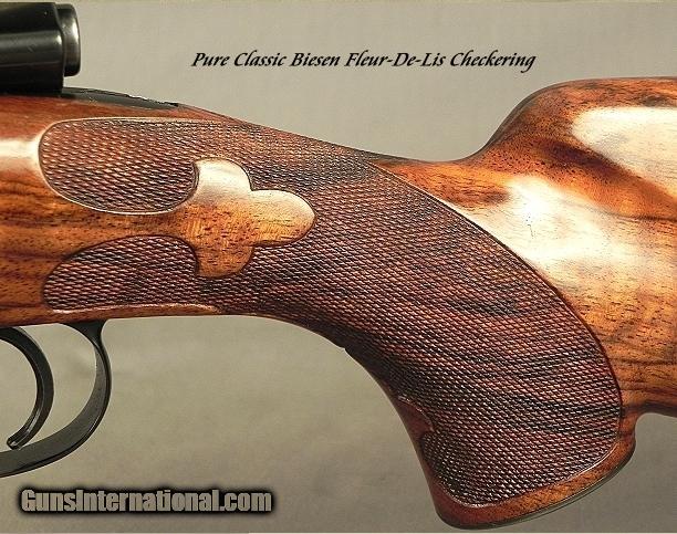 Description: #1123, Al Biesen Gunmaker Spokane, Wn: A 250-3000 Ackley Improved on a Kurz (K) Short Action Mauser Round Top, This gun was made for the original owner in 1982 to be used on Sitka Blacktail Deer on Kodiak Island in Alaska, The custom order to Biesen certainly showed he had very good taste in a Blacktail rifle to be used where snow is almost a given, 23" barrel without any open sights, The barrel is a Pre-64 Featherweight style and profile, Very neat profiled scope bases set-up in an extension fashion with extension rings, 3 x 9 Leupold, Straddle hinged floorplate with a center bow release, A 3-position Model 70 type wing safety, Four panel teardrop bolt knob checkering, Timney trigger, Jeweled bolt and follower, Action rails inside and out are polished, Checkered bolt stop release, A pure Biesen Custom Classic style stock, Biesen classic full wrap around Fleur-De-Lis checkering with a fairly deep recess, Shadowline cheekpiece on the right side of the stock as the owner is left handed but used right hand bolts as left hand actions were not very common in 1982, Sling eyes on the stock, Ebony forend tip, Biesen fully engraved skeleton grip cap with wood checkering, 13" LOP over a fully engraved skeleton butt, 7 lbs. 7 oz. with the scope, An excellent piece of wood with excellent color and black/brown contrast, The original Biesen blue remains at 98%, The original stock finish at 97%, The checkering is at 99%, The bore as new, The gun is accurate and will produce 1" accuracy and better. The owner will send the buyer his loading dies and bunch of cases. This piece is totally like the day it left the Biesen shop. Mr. Al Biesen is the Norman Rockwell of custom bolt rifles in America and his merits are covered extensively in the pages of Jack O'Connor and the Gun Digest. SOLD |
