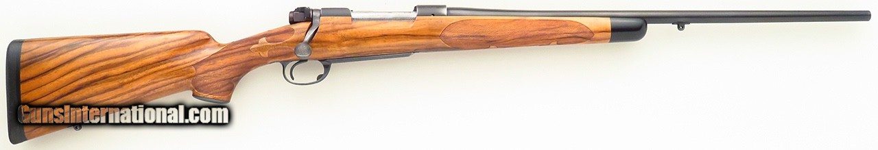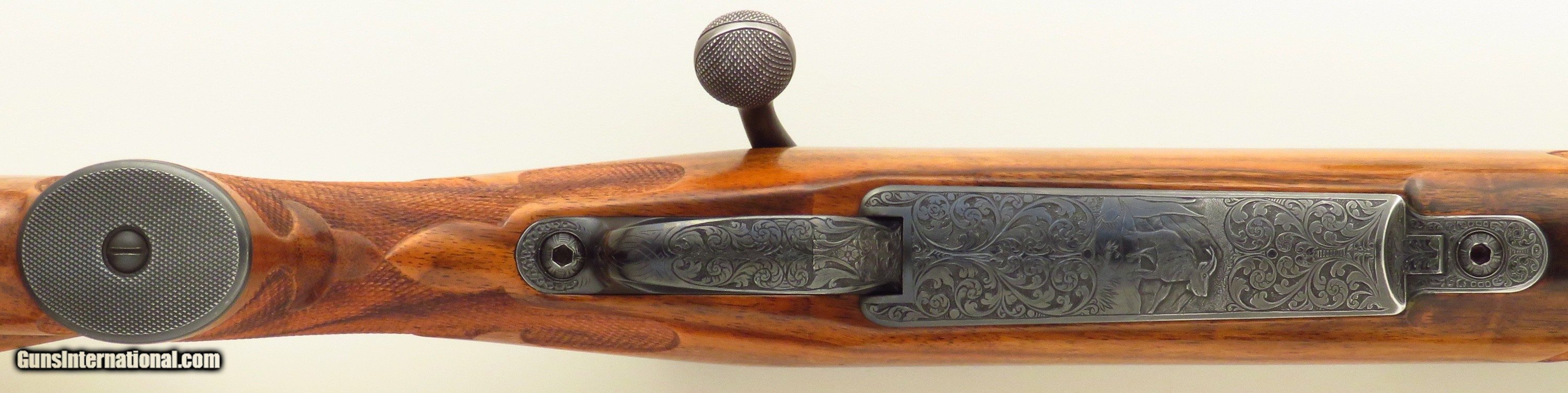 Description: Biesen (Al & Roger) custom pre-64 Winchester Model 70 .300 H&H Magnum. A one-owner rifle completed in 2010, serial 141166 has a 23-inch barrel (light sporter contour, .575-inch muzzle diameter, island sling swivel stud). Features include a magnum-length action, rust blue finish, jeweled bolt body/extractor/follower/rail, reprofiled bolt handle, checkered bolt knob (two panels), three-position safety, reprofiled and checkered bolt release button, custom bottom metal machined by Tommy Burgess and a tuned trigger. STOCK: Crafted from a AA-grade English walnut blank with grain running strong through the wrist, formalities include an ebony forend tip, borderless wrap checkering accented with bold fleurs, scalloped cheek rest with a tapering shadow line, checkered steel grip cap, inletted sling swivel stud and a Pachmayr recoil pad. ENGRAVING: A mountain goat in full profile against a backdrop of peaks by E.C. Prudhomme (signed) is surrounded by intricate leafy vines and dresses the bottom metal to nearly full coverage. DIMENSIONS: Weight is 7.2 pounds and the length-of-pull is 13.8 inches. ACCURACY: The initial test target shows a three-shot group (100 yards, 180-grain AccuBond handloads) measuring .60-inch center-to-center is included. Nosler 200-grain Partition loads also perform very well. CONDITION: The bore is superb, strong and bright. Metal finish is at least 95 percent with trace silvering at the muzzle, bolt handle and shroud. Wood crowds 98 percent with a few minor impressions. The price is firm and layaway is available. $8,500 plus shipping. SOLD Rifle Caliber: .300 H&H Magnum |