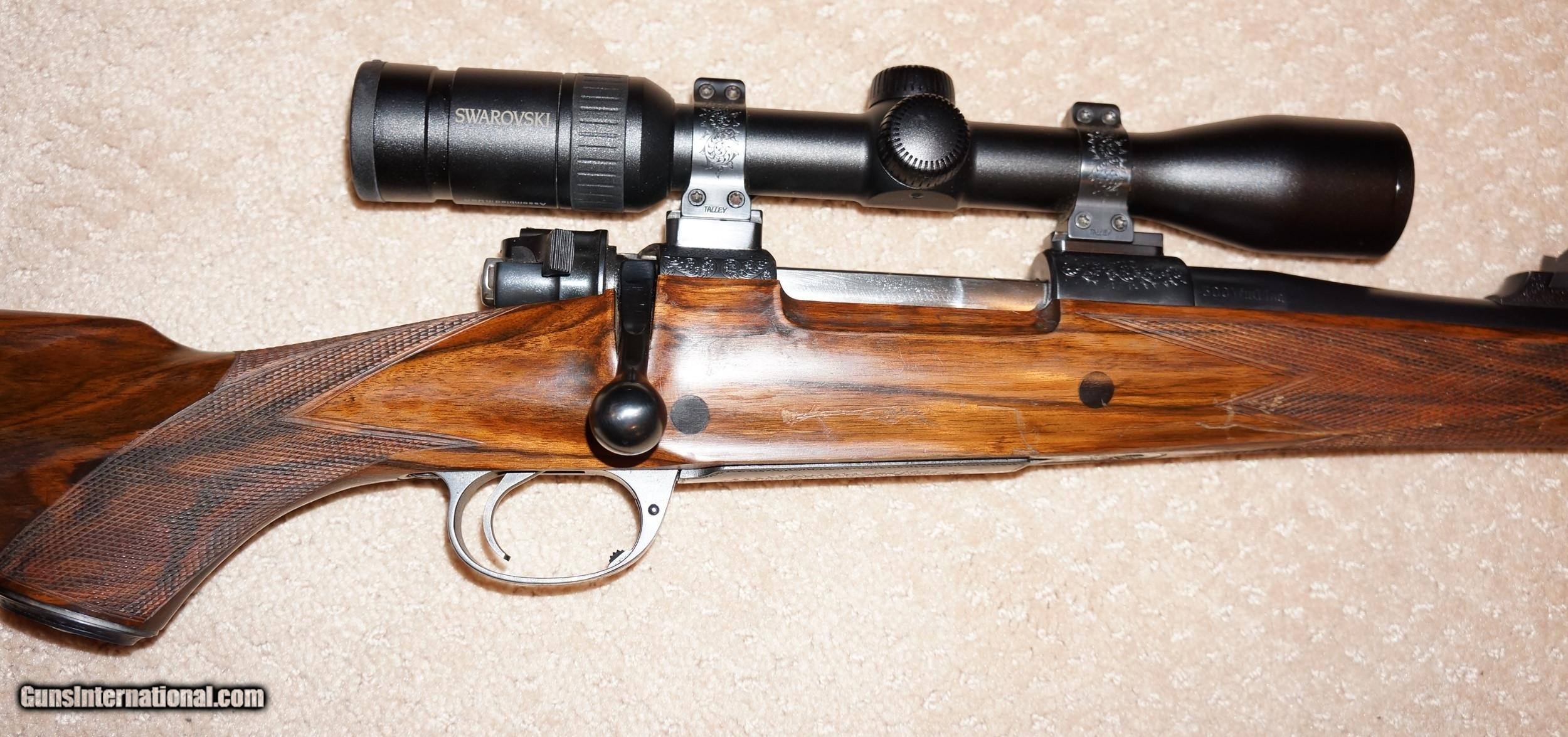 Description: Custom control-feed FN Mauser with claw extractor by custom gunmaker, Bill Harvey. His name is engraved on the barrel. Wing safety. Block island rear sight with one fixed blade at 100 yards and two other foldable blades marked 200 and 300 yards. Barrel-banded front sight with hood and barrel-mounted swivel stud. 23.5" barrel. Classic Bastone walnut stock with cheekpiece. Trapdoor grip cap and leather-covered Pachmayr Decelerator recoil pad. Finely scroll engraved floorplate, trigger guard, action top, grip cap, front sight hood, sides of rear block island sight and Talley rings. Swarovski 3-9X36 Z3 variable scope. I have used the gun on one mountain hunt. It is accurate and has only had a couple of boxes of Federal Premium ammo through it. It has some honest use marks in the wood along the right side of the action and edge of the chekering on the right side. These are not serious but are more substantial than gun safe handling marks. Light handling marks otherwise. Very small blueing wear spot on the underside of the barrel near the swivel stud. That's about it. These blemishes are easily fixed by anyone with wood working skills. More pictures on request. It's a fine custom rifle that would otherwise be priced $5500-$6500, but it's priced now to account for the marks on the stock and for quick sale. Email is the best method of contact. Thank you!! SOLD |